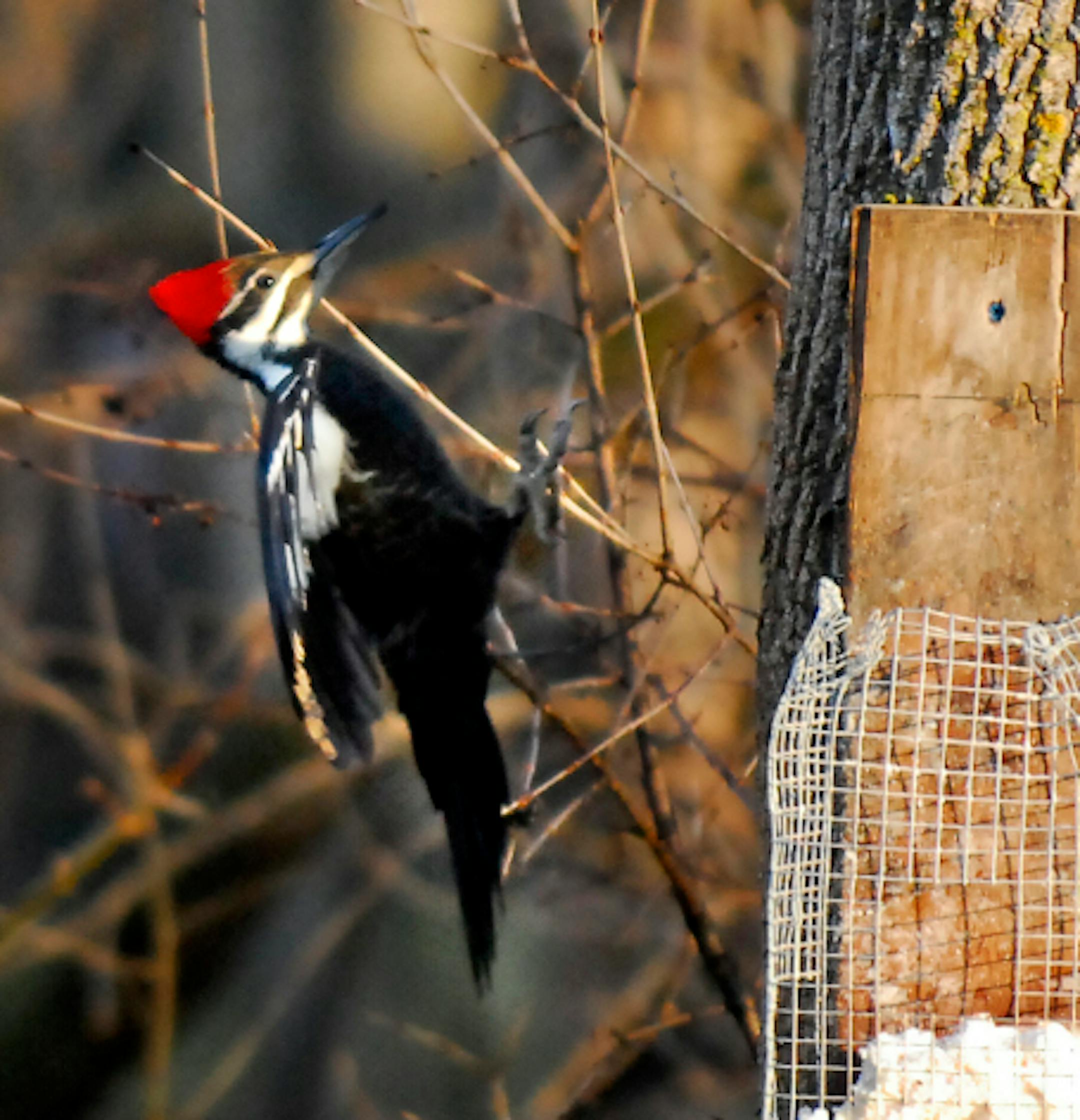 A Pileated Woodpecker comes to our suet feeder each day. It first lands on a 70-foot tall cottonwood, then swoops 100 feet to the feeder. Mostly, on the swoop it moves like a rocket, wings folded, tail acting as a rudder as it flies around tree branches. I've tried to photograph its landing on the suet tree. I've wondered what manuevers are necessary to slow its fast approach. It does open its wings just before landing, as seen here, and then just pulls its feet into position and grabs the tree. Just what you'd think, I suppose. It happens so fast, though, that I couldn't see the details of the action until I used a camera. The photo was taken at 1/1000th of a second.