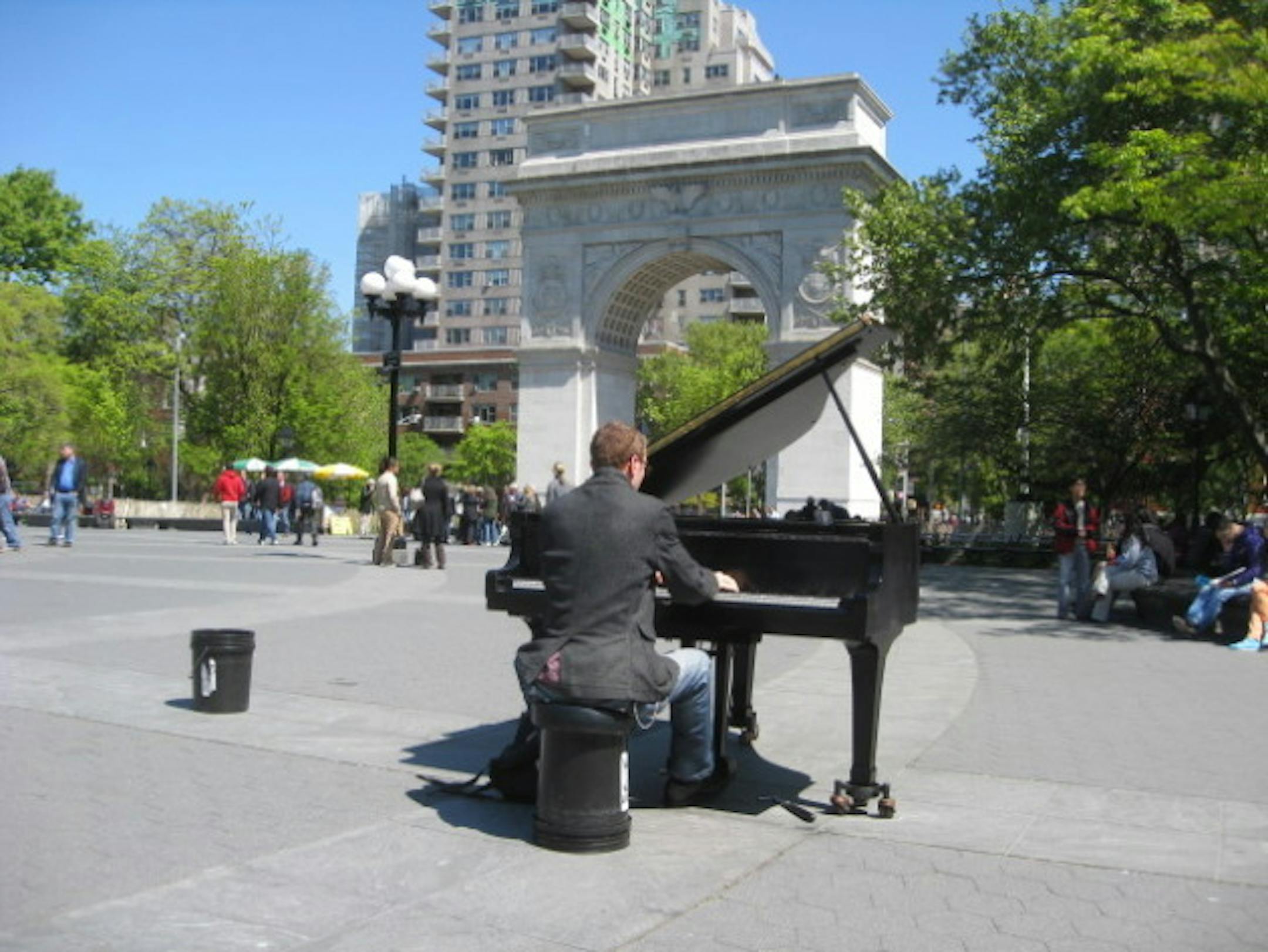 NEW YORK CITY -- Colin Huggins was a little groggy but upbeat. The 34-year-old left his home in Atlanta to be an accompanist for ballet dancers. Like many here, he's learned to adapt. Every weekend, he somehow pushes his Yamaha grand piano on rollers to Washington Square Park. He brings along three buckets -- two for spare change and dollar bills. He flips over the third one, places a cushion on it and sits down on the makeshift piano bench and bangs out classic music and little jazz.
