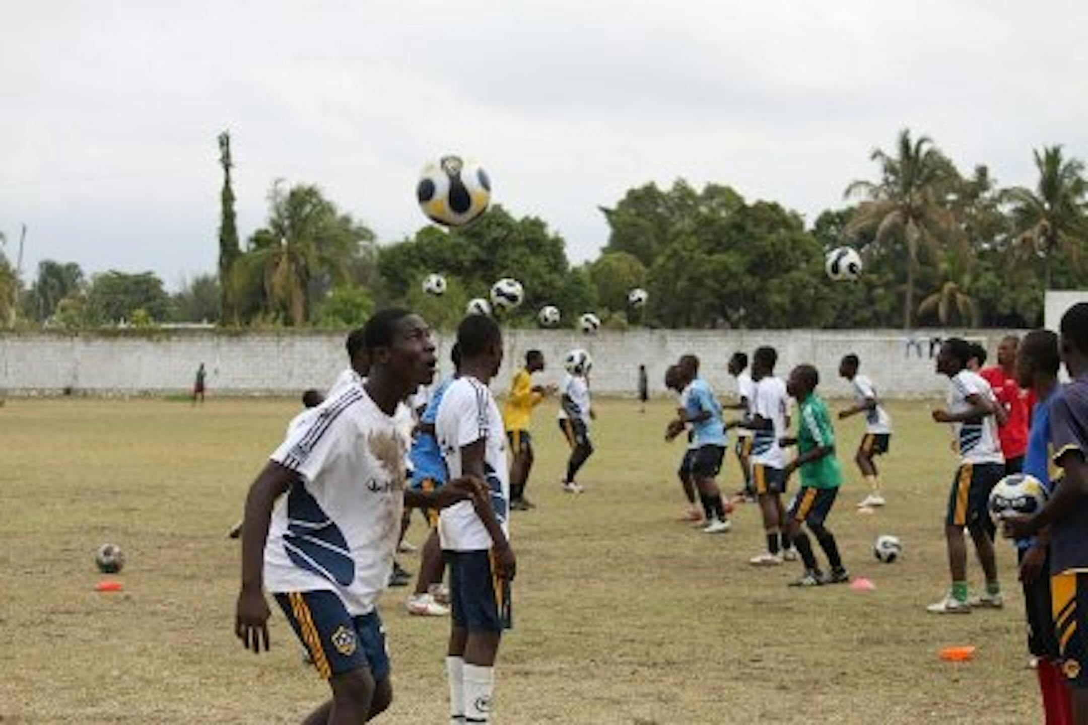 I woke up this morning at 6:00 am after a huge rain storm last night and immediately thought about all of those displaced kids and hoped they were alright physically and mentally. Fortunately, soccer was still on today and we could keep the momentum going. As I got to practice area, I noticed open fields but the under 17 team and the under 19 team was separated and only one was ready to practice. The coaches told me that they can't practice at the same time because many of the kids had to share shoes. From our Kick it Back program, we gave out about 30 pairs of cleats, which quickly brought smiles to their faces. We also dressed the U19 team in full L.A. galaxy gear and got the U17 team into Sanneh Soccer t-shirts and shorts. They all received gear with the message that they were dressing like professionals so they should respect the practice time and give full attention and effort. It worked.
