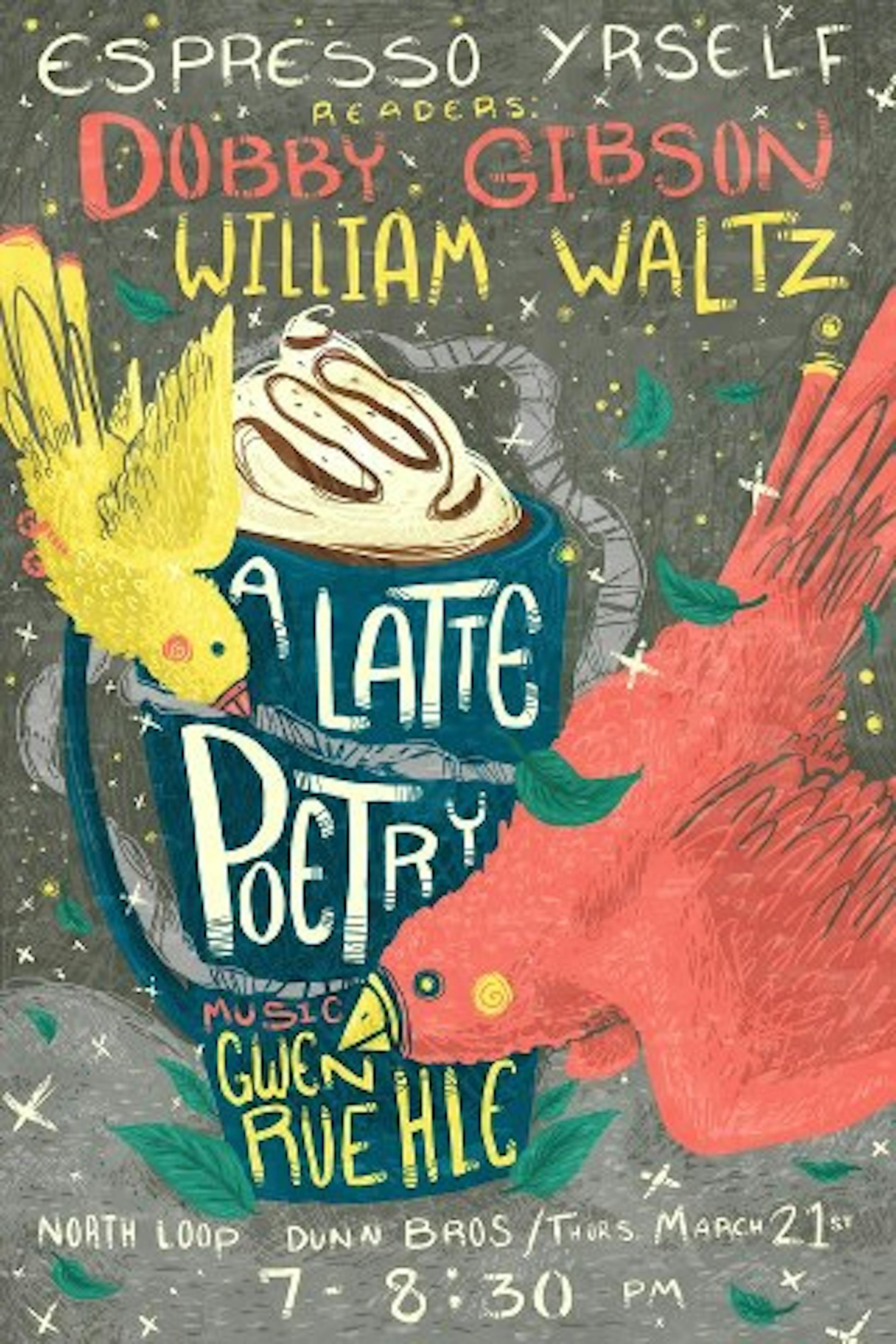 And yet even more reading series are starting to pop up, and that can only be a good thing. We've already told you about Cracked Walnut, and the month-long daily series it is currently hosting. And tonight is the second reading in the Espresso Yrself series, which opened in February with four writers and some musicians over at Angry Catfish, which drew a crowd of about 50 people, and which continues tonight with poets Dobby Gibson and William Waltz, this time at Dunn Brothers in the North Loop.