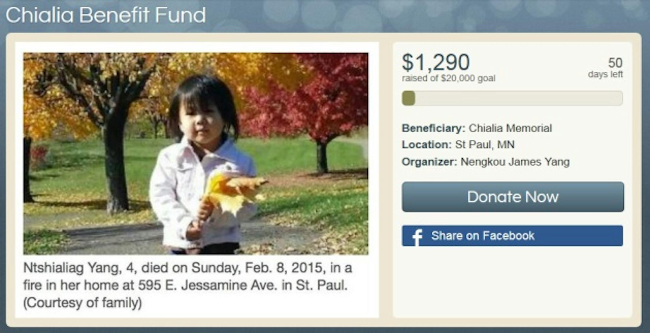 The family of 4-year-old Ntshialiag (pronounced Chialia) Yang, who died after her family's home caught fire Sunday, is accepting donations.