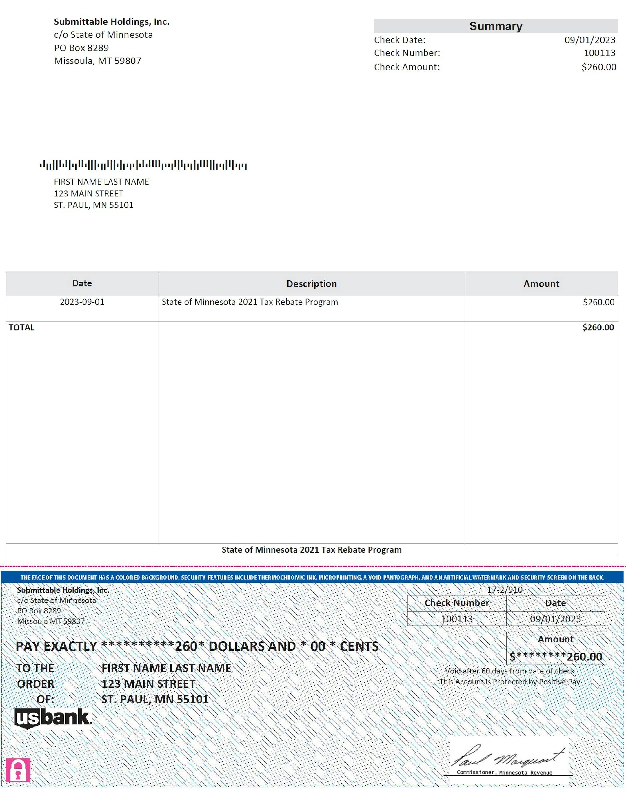 The checks list Submittable Holdings c/o State of Minnesota, PO Box 8289, Missoula, MT 59807. A description with the check describes it as the "State of Minnesota 2021 Tax Rebate Program."