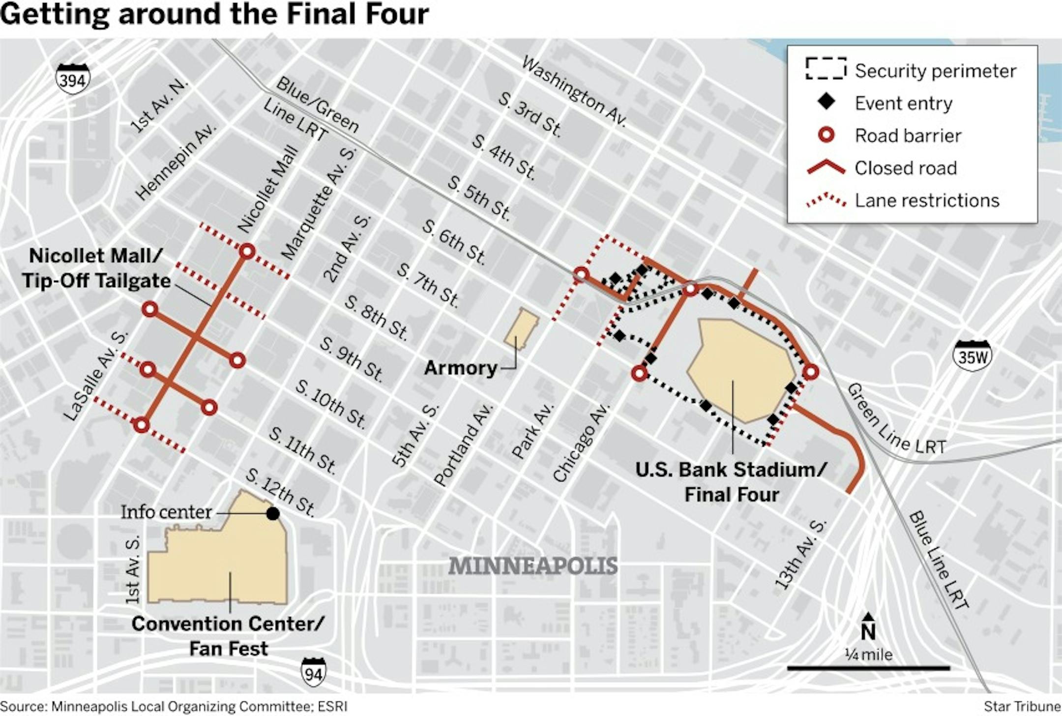 With all tournament events within a mile of one another, the upcoming NCAA Final Four in downtown Minneapolis will be easily walkable.