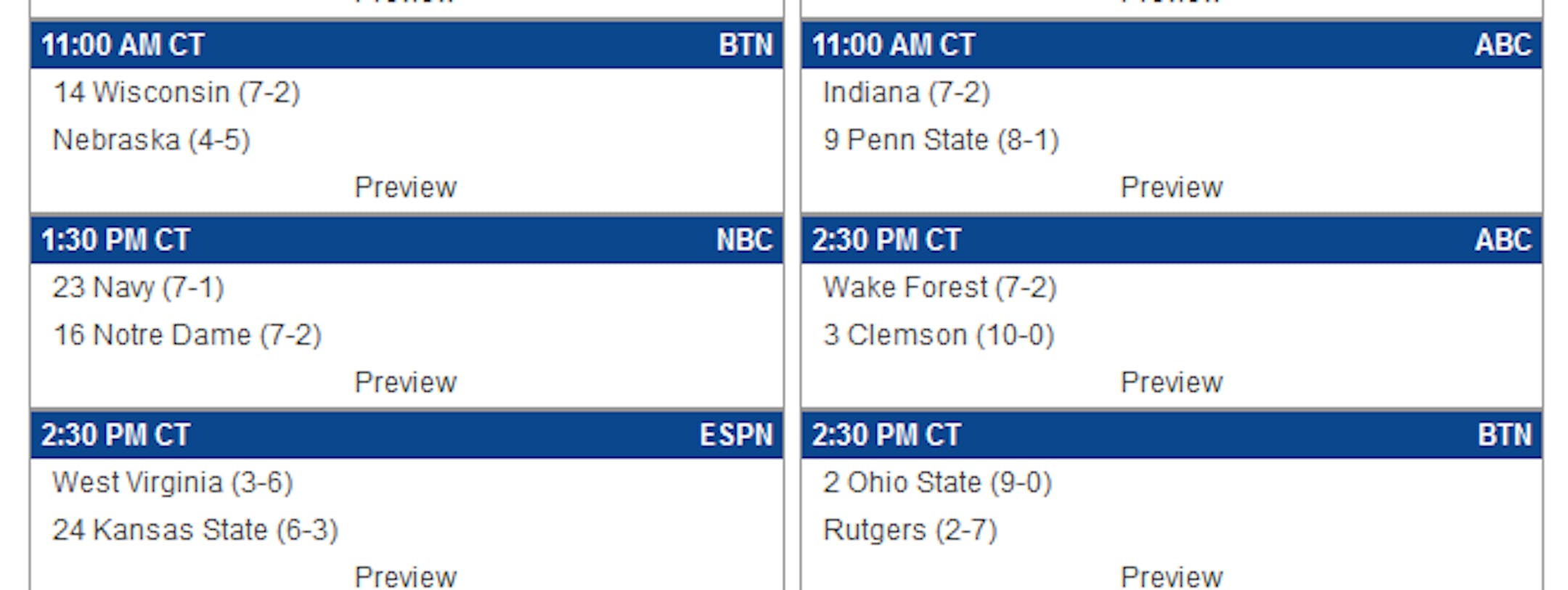 This one is interesting: No. 10 Oklahoma has one loss and plays undefeated (and No. 13) Baylor. If the Sooners lose, that would be their second loss. If Baylor wins, you'll be hearing people wonder if the Bears will make the same leap in next week's rankings that the Gophers made this week, when they went from No. 17 to No. 8.