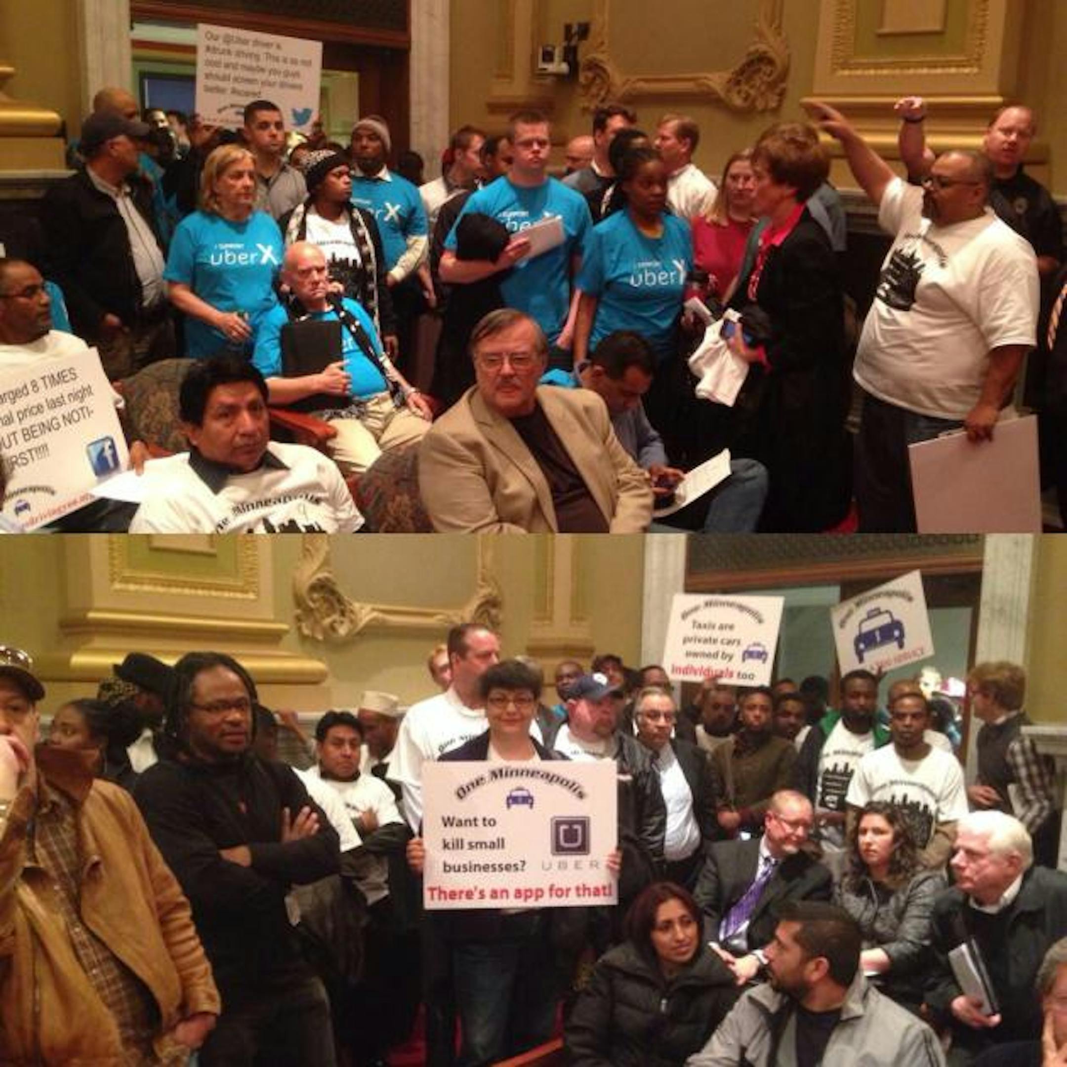 Pink mustaches, custom T-shirts, petitions and placards flooded City Hall Tuesday as opposing transportation companies clashed at a public hearing over proposed regulations for app-based services like Lyft and UberX.