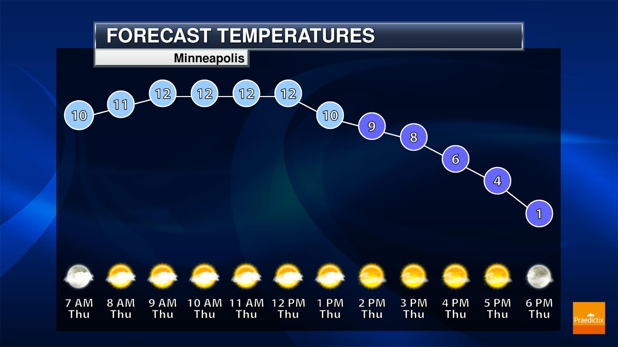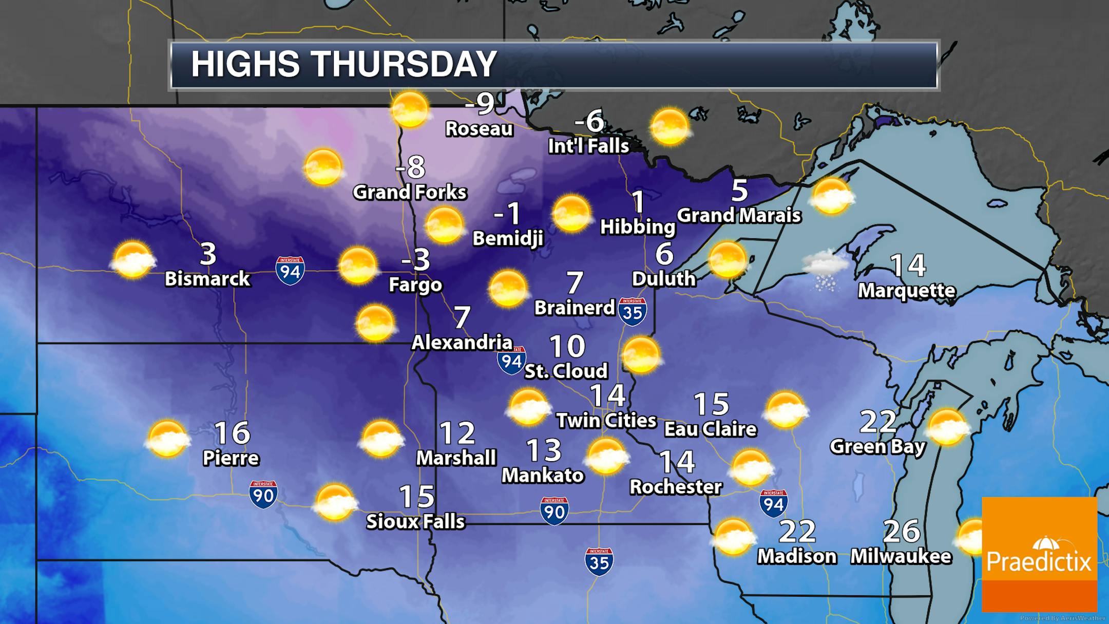 While it'll be a mainly sunny day in the Twin Cities on Thursday, I can't rule out a few flurries during the morning hours as a clipper moves through. Unfortunately, the clipper that brings that light snow chance ushers in another batch of cold air, and after morning/midday highs in the low/mid-teens, temperatures will drop through the afternoon hours.