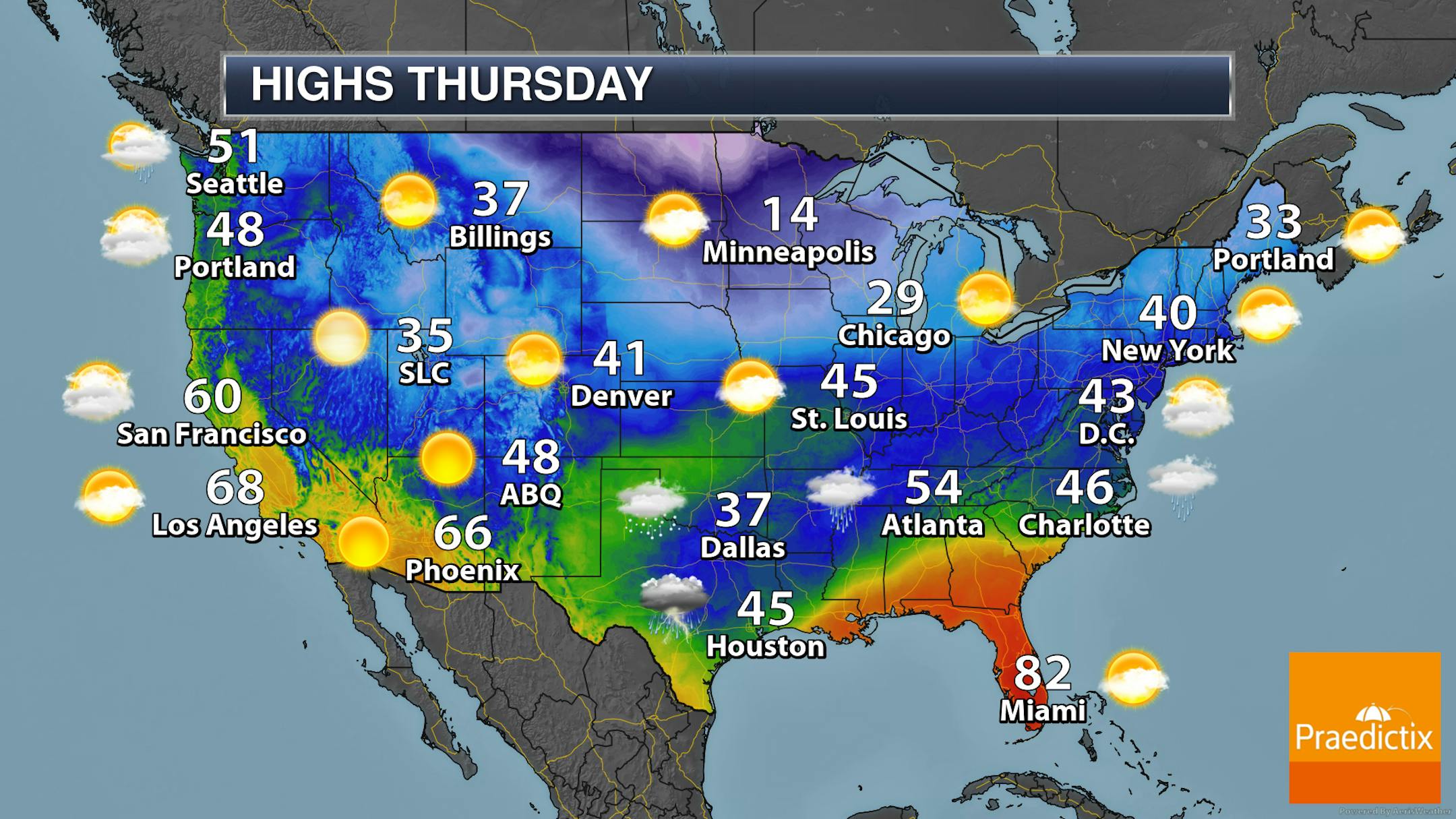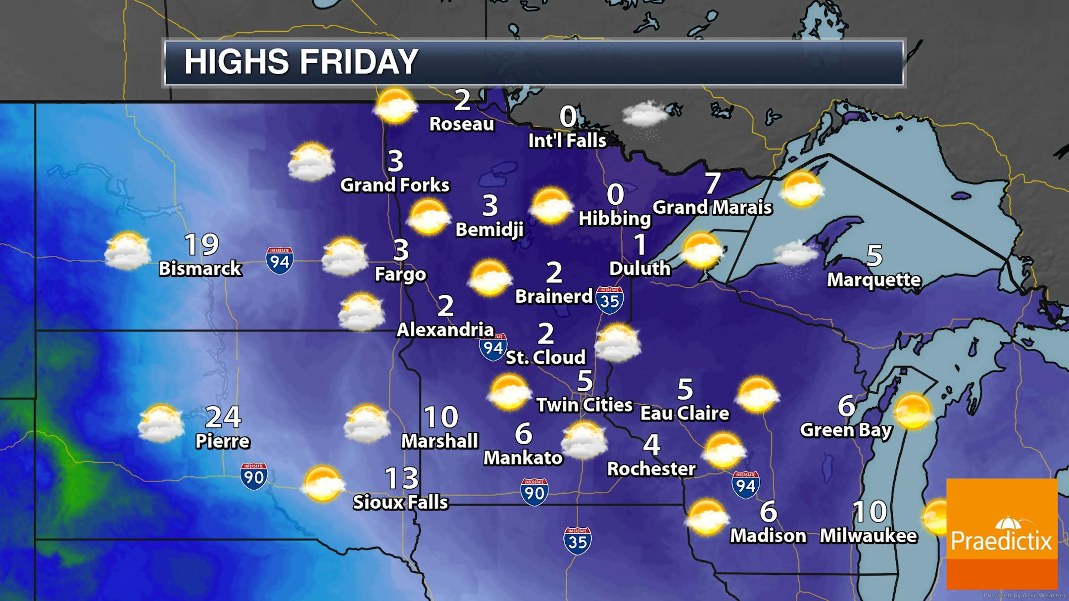 As we head into Friday, the next blast of cold Canadian air fully settles into the region, with highs only expected to reach the single digits under a mix of sun and clouds.