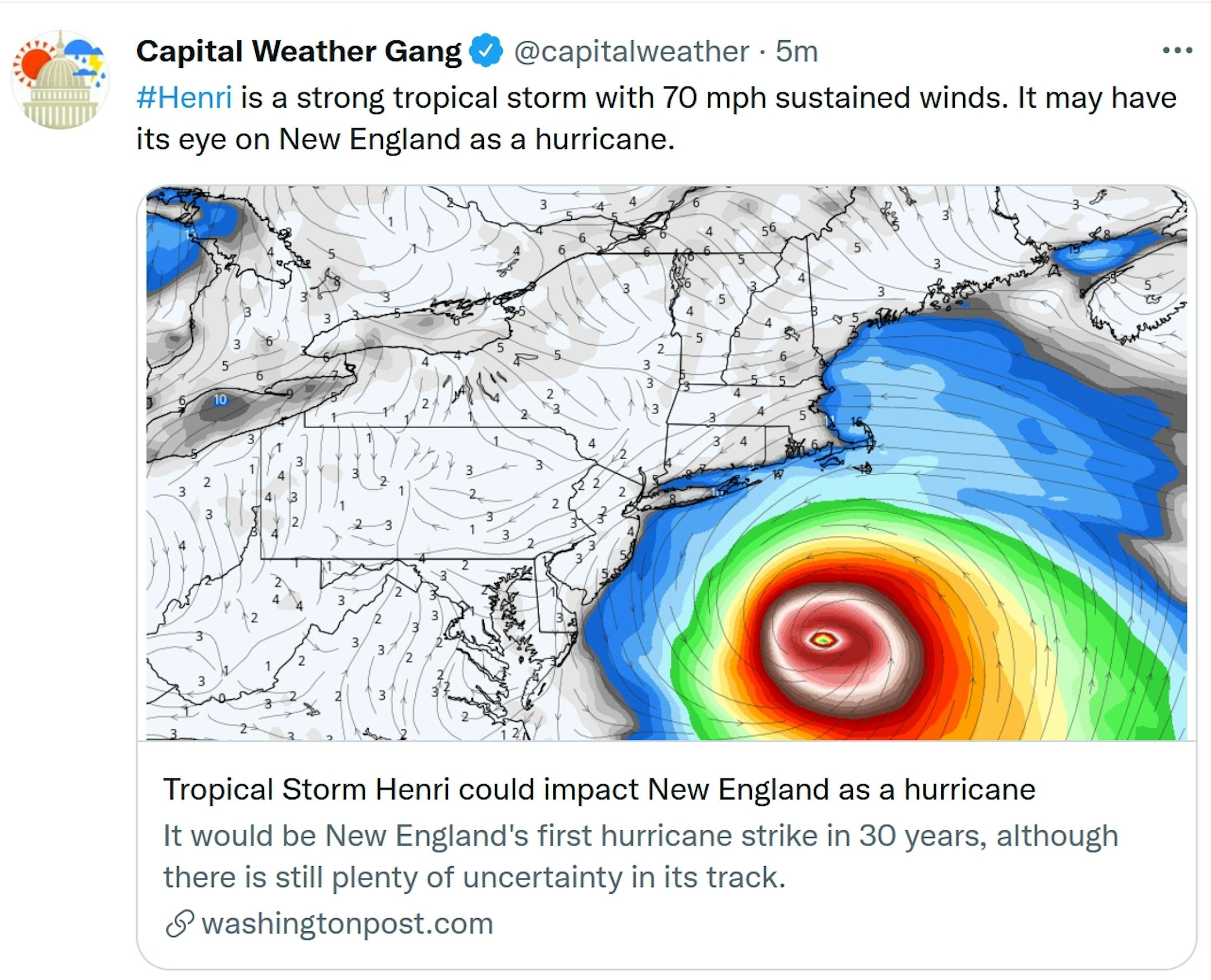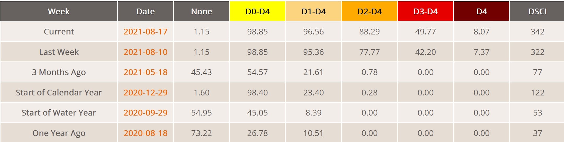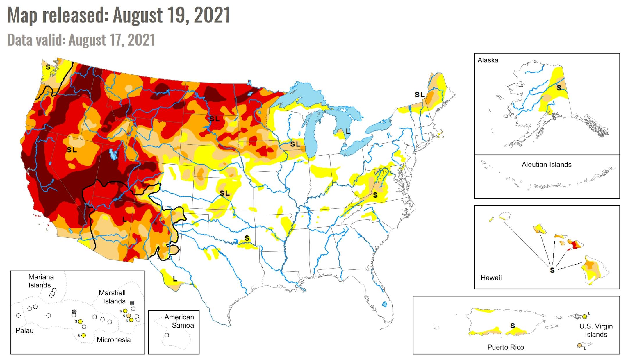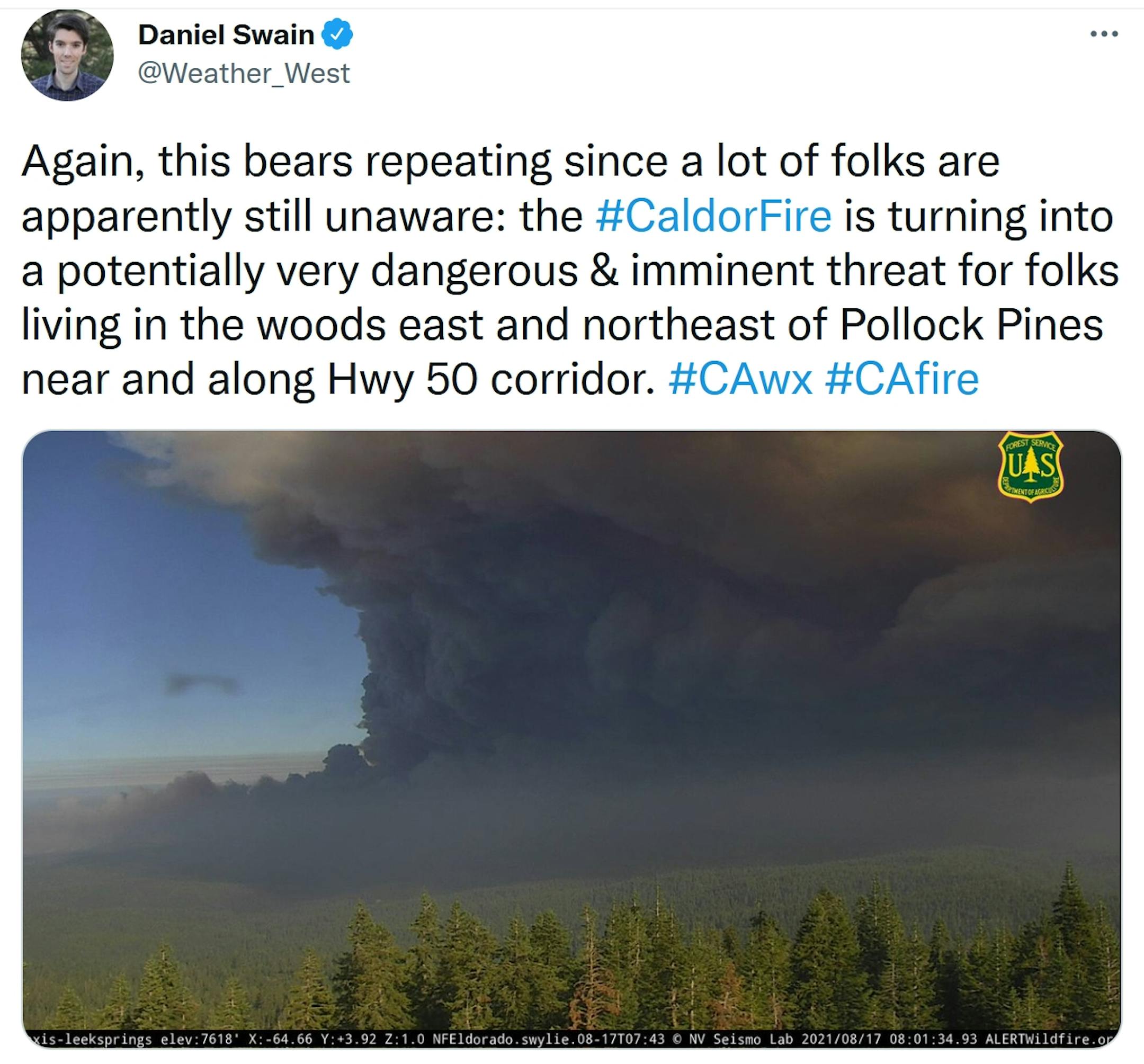 Climate-Fueled Fires Rage Across NorCal: Climate Nexus has headlines and links: "Northern California is under a siege of wildfires and smoke, fueled by drought and heat made worse by human-caused climate change, and the list of cities and towns under evacuation orders is long. The Caldor Fire continued its rapid expansion Wednesday, growing at double the pace of firefighters' models from roughly 30,000 acres on Tuesday to 62,586 acres Wednesday night. The even larger "megafires," Dixie, McFarland, and Monument, have also continued growing. The Dixie Fire has incinerated an additional 66,000 acres since Monday, becoming the first known fire in state history to burn all the way from the western slopes of the Sierra Nevadas, across the mountains, and into the eastern valley floor. As the fires roar through tinder-dry fuel, they are wiping out forests central to California's plans to reduce the state's carbon emissions, and filling the air with hazardous pollution. The fact that 30 fire engines and their firefighters were moved from the Dixie Fire to fight the Caldor Fire illustrates just how thin firefighting resources are stretched, due in part to the widespread conflagrations burning across the continent. ("Canada is burning as well," Cal Fire director Thom Porter told the Sacramento Bee.) Though still much smaller, the exceptionally fast-burning Cache Fire destroyed dozens of homes and threatened an elementary school, forcing children to hurriedly flee as flames burned just across the street. Reaction to the fire near Clearlake was initially limited, officials said, because some local crews were already deployed to assist in fighting the Caldor Fire. The extended drought and recent heat, both made worse by climate change, have created conditions ripe for the exceptionally destructive fires. "It's important for all Californians to understand the severity of how our climate-driven conditions are altering the environment and are making these fires move faster and making them more complex and, ultimately, more dangerous than anything we've faced in the past," Mark Ghilarducci, director of the emergency services office, told reporters." (Fires: Washington Post $, AP, New York Times $, Axios, NBC; Caldor Fire growth: Washington Post $, SFGATE, Sacramento Bee $, San Francisco Chronicle $, ABC, CBS, Washington Post $; Dixie Fire: San Francisco Chronicle $; Carbon emissions: AP; Air quality: New York Times $, Sacramento Bee $; Limited resources: Sacramento Bee $; Cache Fire: San Francisco Chronicle $, ABC-7; Climate Signals background: 2021 Western wildfire season, Drought)