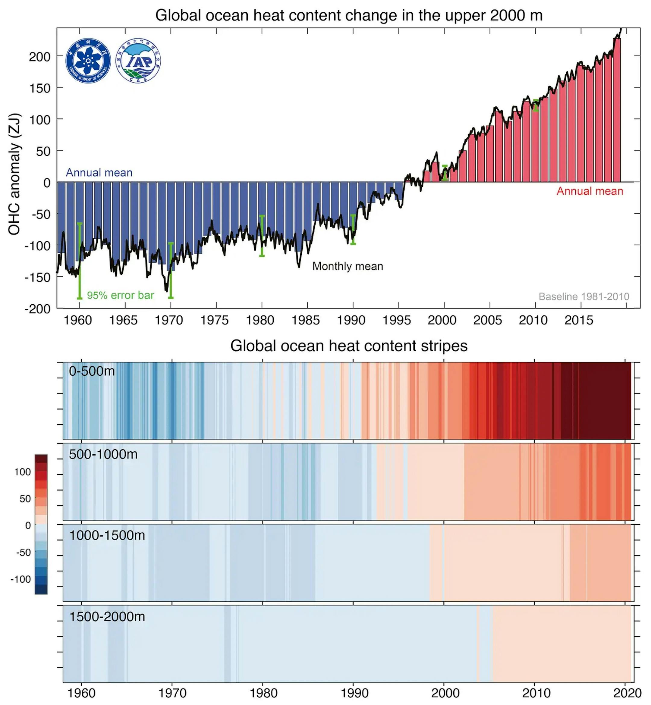 The average global temperature change at different ocean depths, in zetajoules, from 1958 to 2020. The top chart shows the upper 2,000 meters (6,561 feet) compared with the 1981-2010 average. The bottom shows the increase at different depths. Reds are warmer than average, blues are cooler. (Cheng et al, 2021, CC BY-ND/The Minnesota Star Tribune)