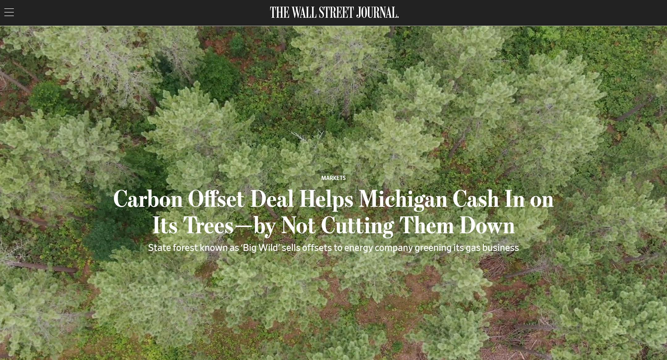 Carbon Offset Deal Helps Michigan Cash In on Its Trees - By Not Cutting Them Down. The Wall Street Journal (paywall) reports: "The Pigeon River Country State Forest generates cash from timber sales, oil-and-gas leases, hunting licenses and camping fees. Now the foresters who look after its towering red pine, bleach-barked aspen and elk will manage the roughly 110,000 acres for a new moneymaker: carbon offsets. Michigan's Department of Natural Resources has agreed to limit logging in the Lower Peninsula forest known as the "Big Wild" over the next four decades to create carbon offsets, a climate-change currency that companies use to compensate for emissions. DTE Energy Co,Michigan's largest energy company, has agreed to buy the offsets and is marketing smaller carbon footprints to customers of its natural-gas business who are willing to pay a monthly fee to go green..."