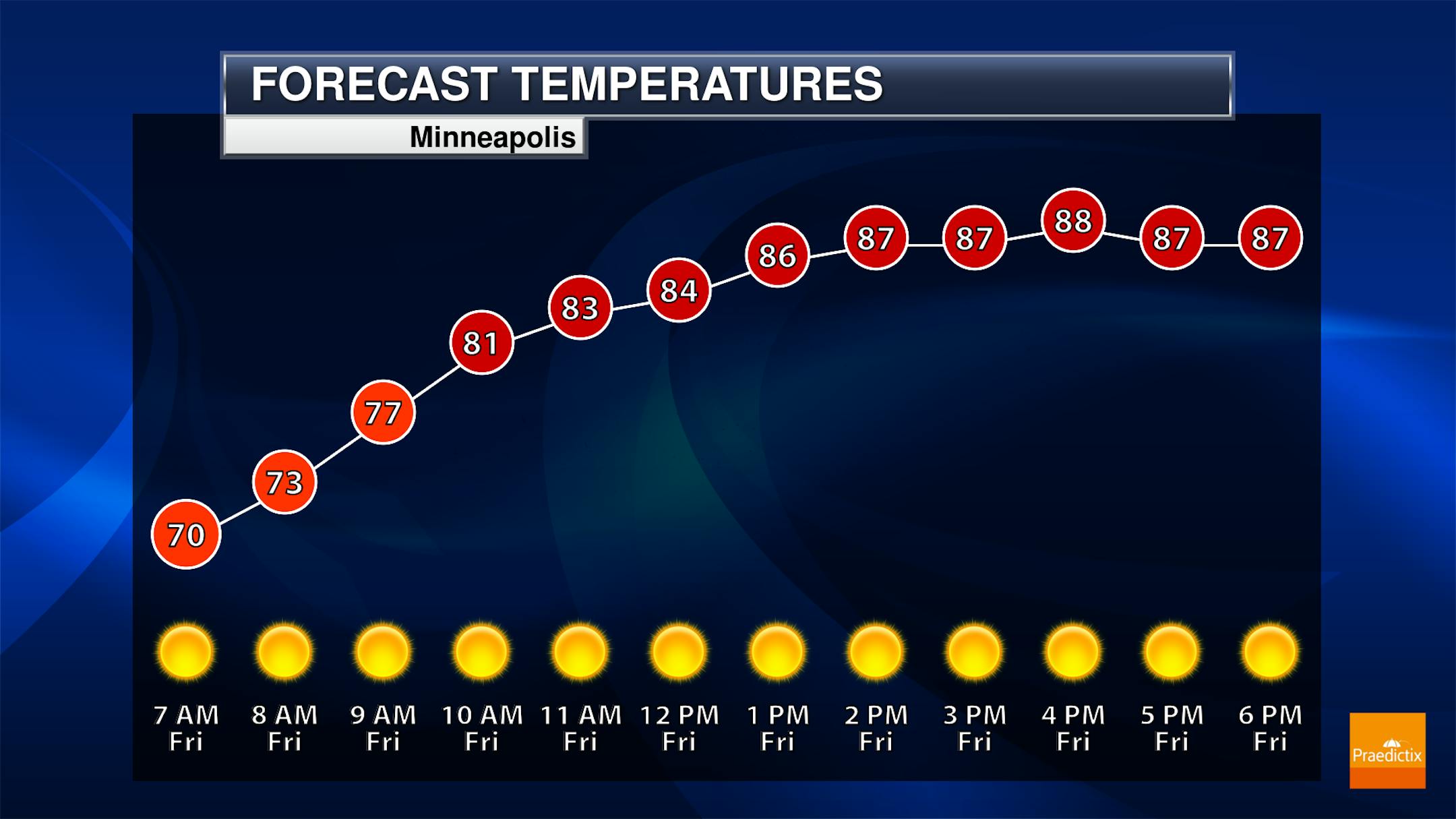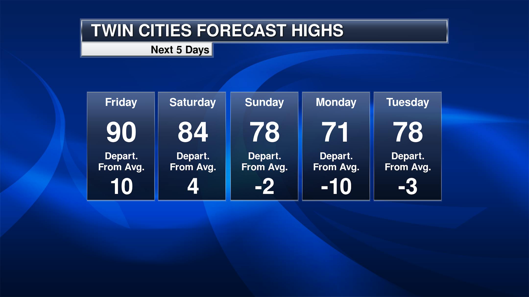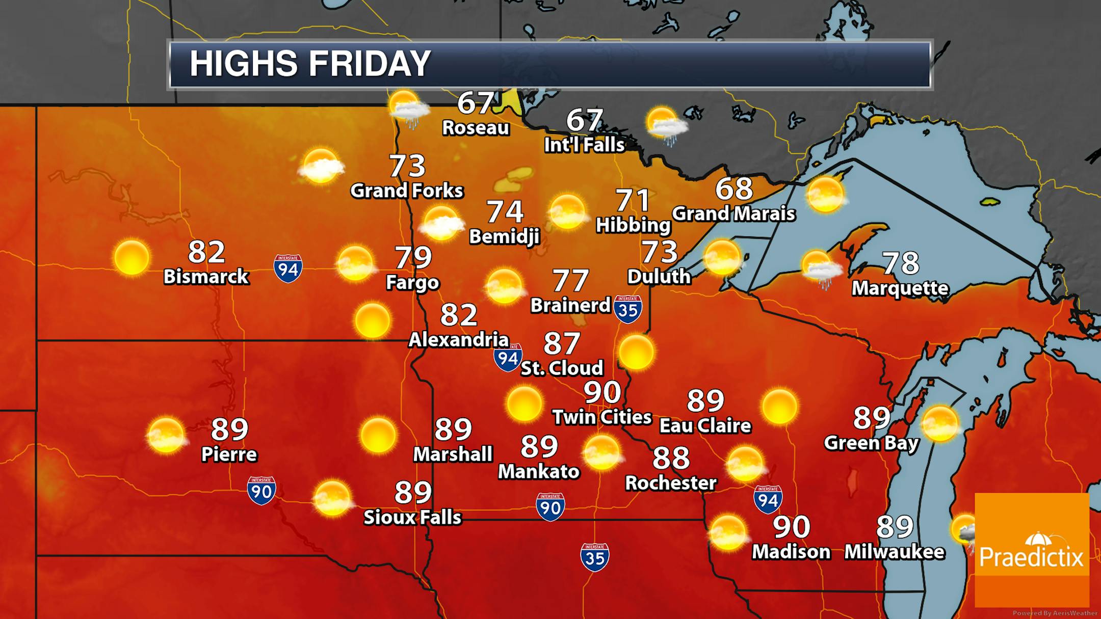 You can see the cooler air starting to work in across northern Minnesota where highs will be in the 60s and 70s compared to the 80s and 90s across the southern half of the state. A cold front approaching northern Minnesota could bring in a few afternoon and evening rain across the northern third of the state. Otherwise, mainly sunny skies are expected.