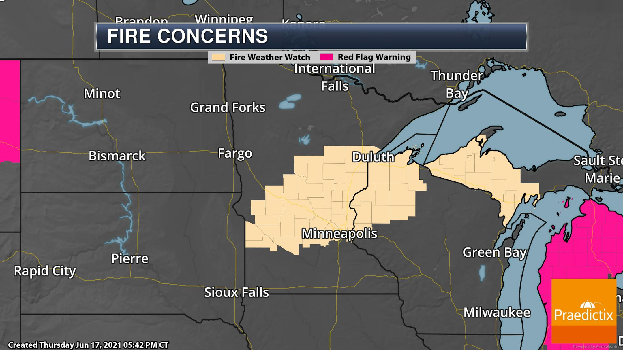 Due to expected gusty winds and low humidity values, a Fire Weather Watch has been issued for portions of central and northern Minnesota for Friday afternoon and evening. With those conditions - and fairly dry weather recently - any fires that develop could quickly spread.