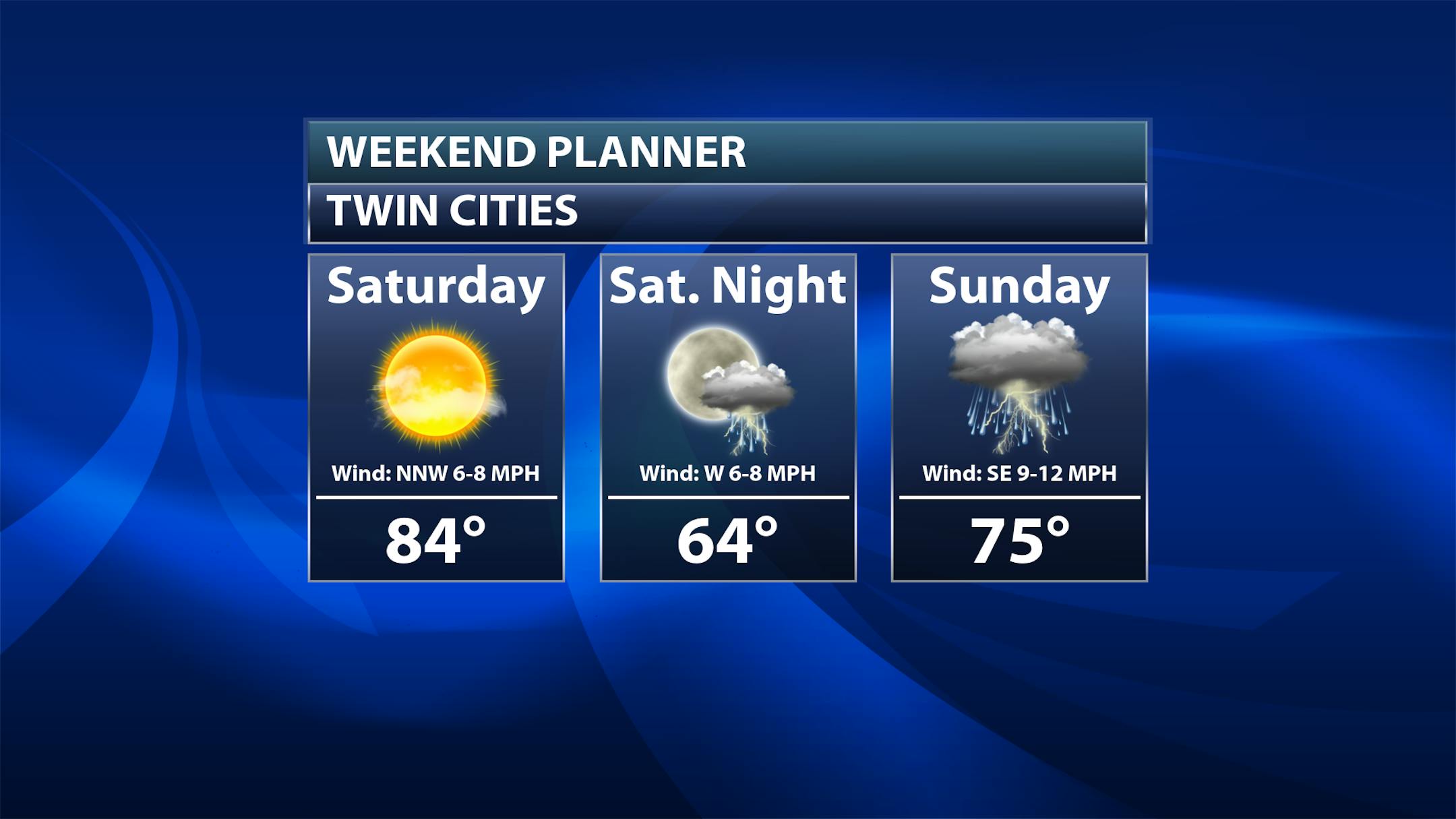 Don't forget - it's Father's Day weekend! Saturday will be the nicer day of the weekend for outdoor activities like grilling as highs reach the low to mid-80s in the Twin Cities with mainly sunny skies. As we head toward Sunday, a system will be working through the upper Midwest with showers and thunderstorms likely. Highs may only be in the 70s on Sunday.