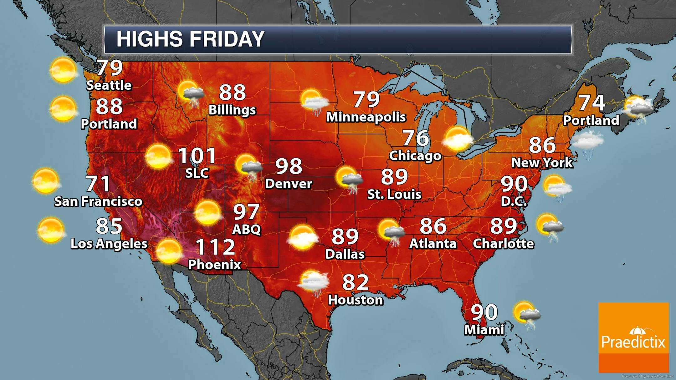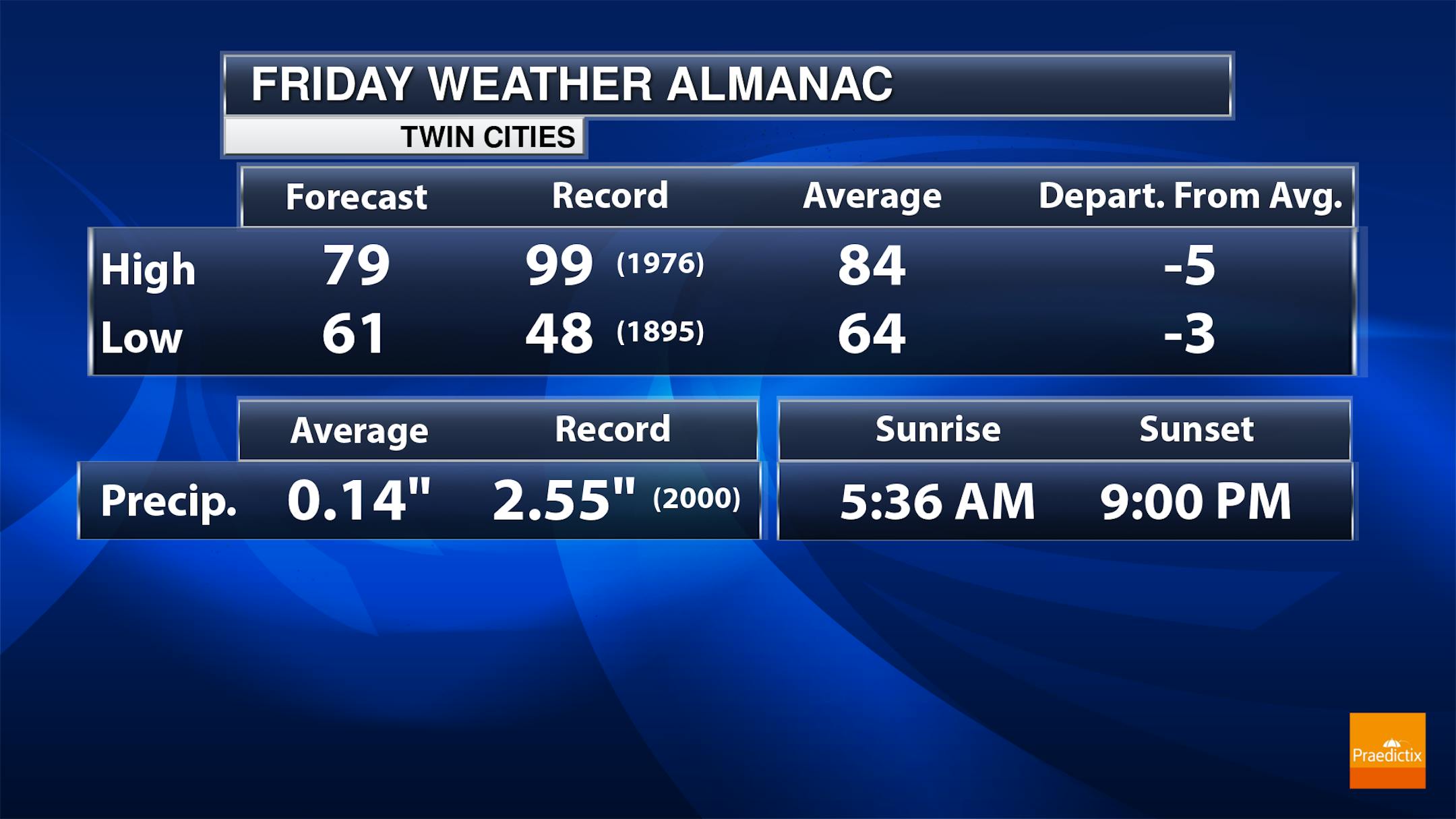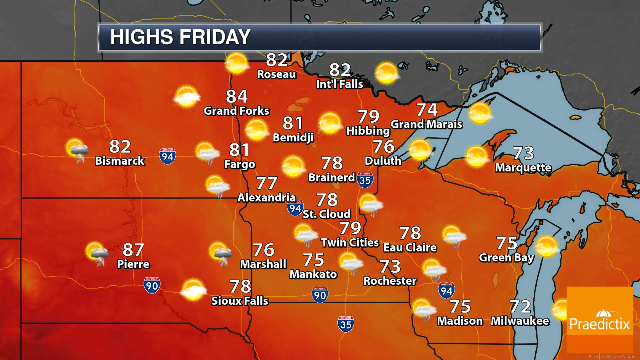 Looking statewide, you see those rain icons across southern Minnesota for Friday with sunnier skies as you head north. Highs will be in the 70s and 80s across the state - below average in central and southern Minnesota, but above average in northern Minnesota.