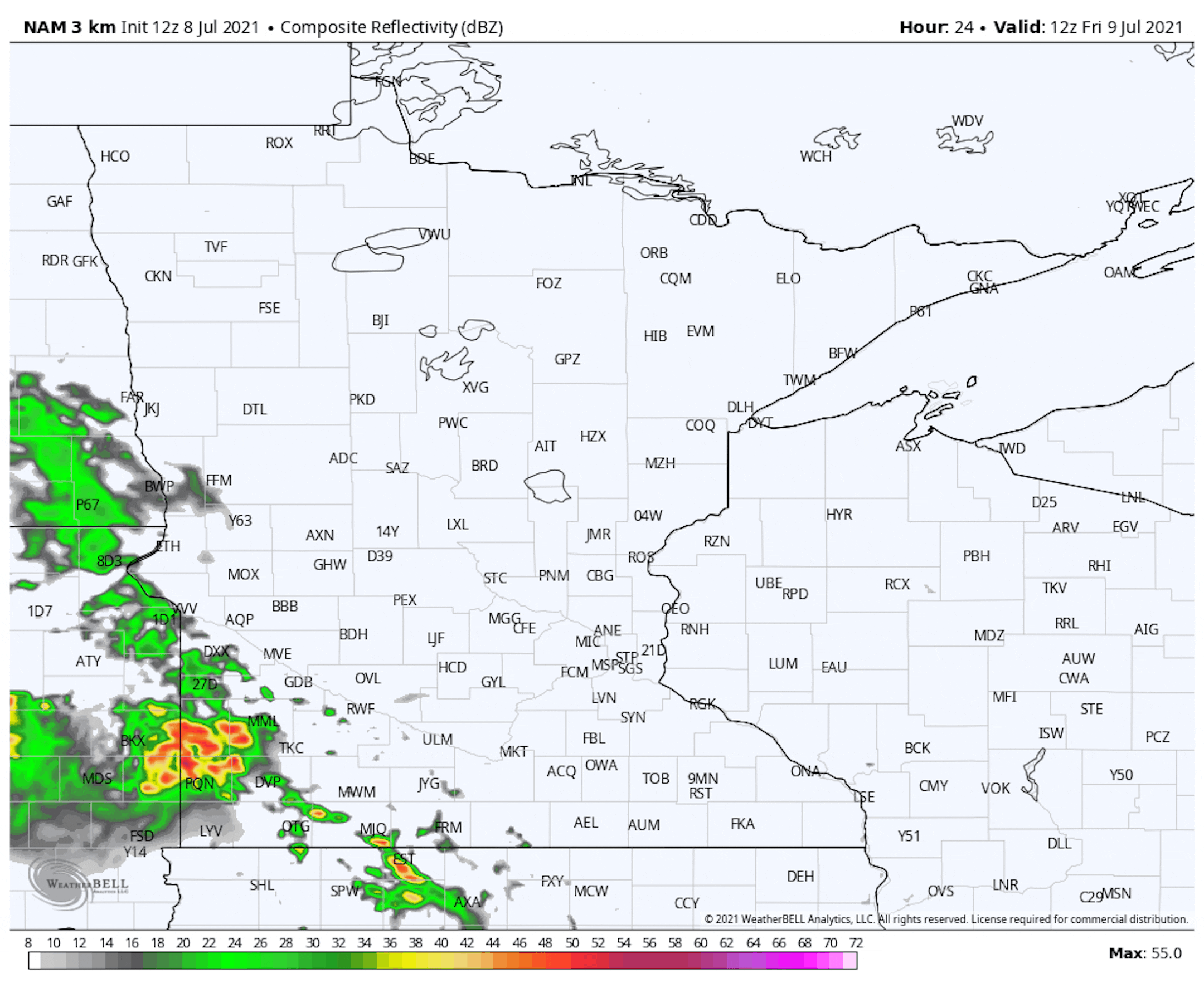 Again, the best chance of seeing rain will be across southern Minnesota, mainly along and south of the Minnesota River, during your Friday. The loop above shows simulated radar between 7 AM and 7 PM Friday.