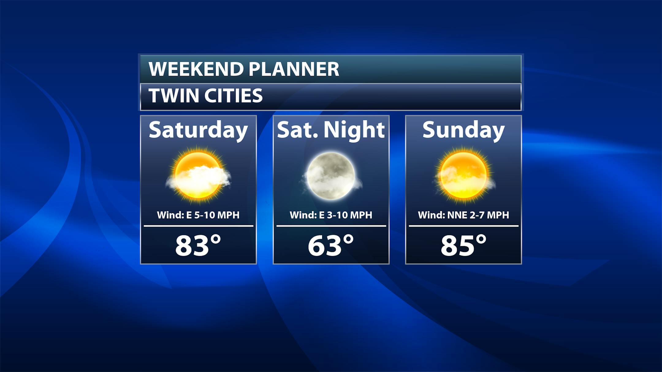 It should be a dry and fairly sunny weekend in the Twin Cities. I can't rule out an isolated shower on Saturday, mainly across far southern Minnesota, but that could lead to a few more clouds at least for the first half of the weekend. We will see slowly warming temperatures through the weekend and into early next week, and by mid-next week highs could be back up around 90F once again.