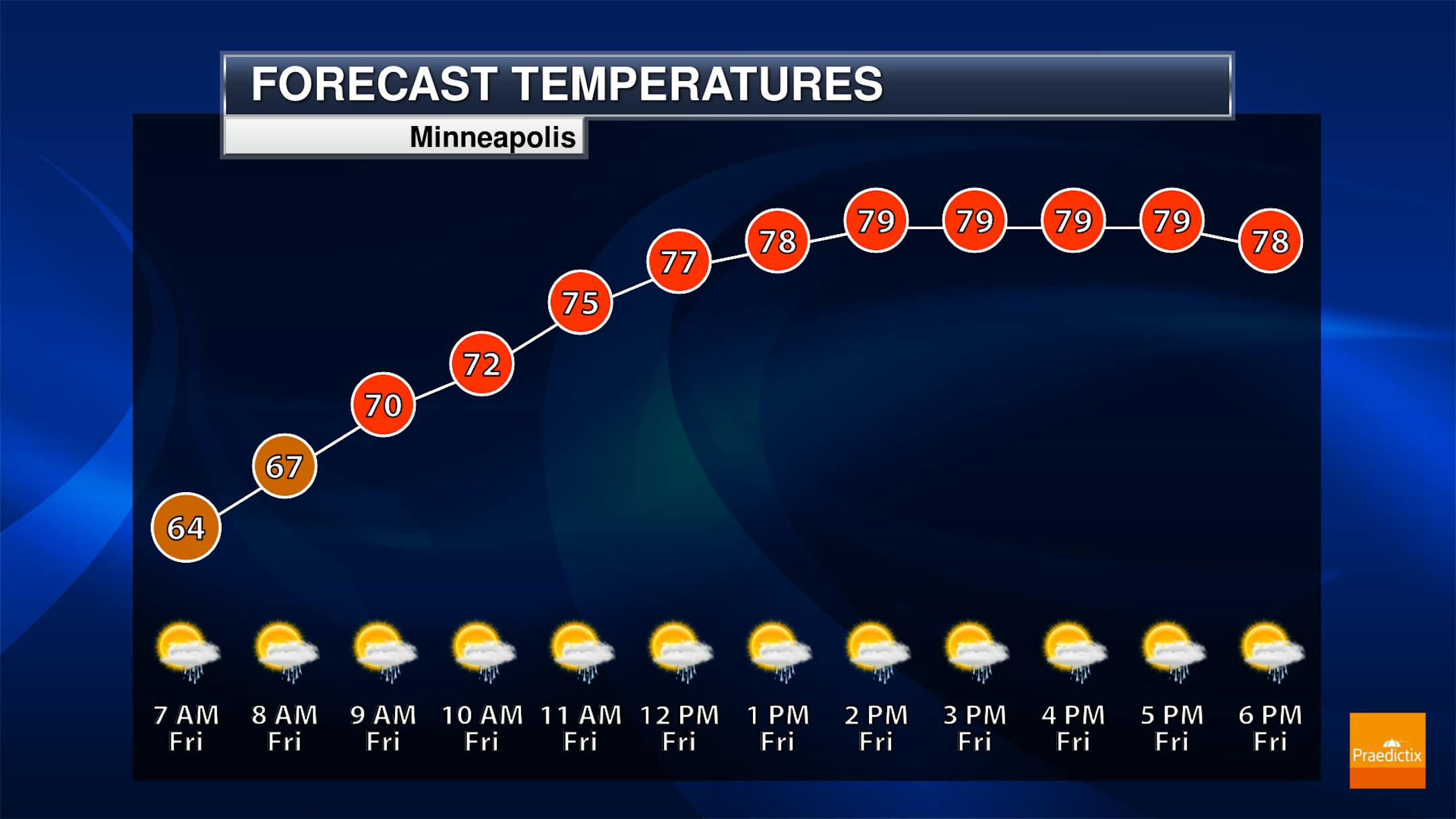 As we roll into the last day of the work week, we will see a mix of sun and clouds with a few showers across southern Minnesota, potentially in the Twin Cities as well - though I do think most of the rain will fall south of the metro. Morning lows will be in the low 60s with afternoon highs in the upper 70s.