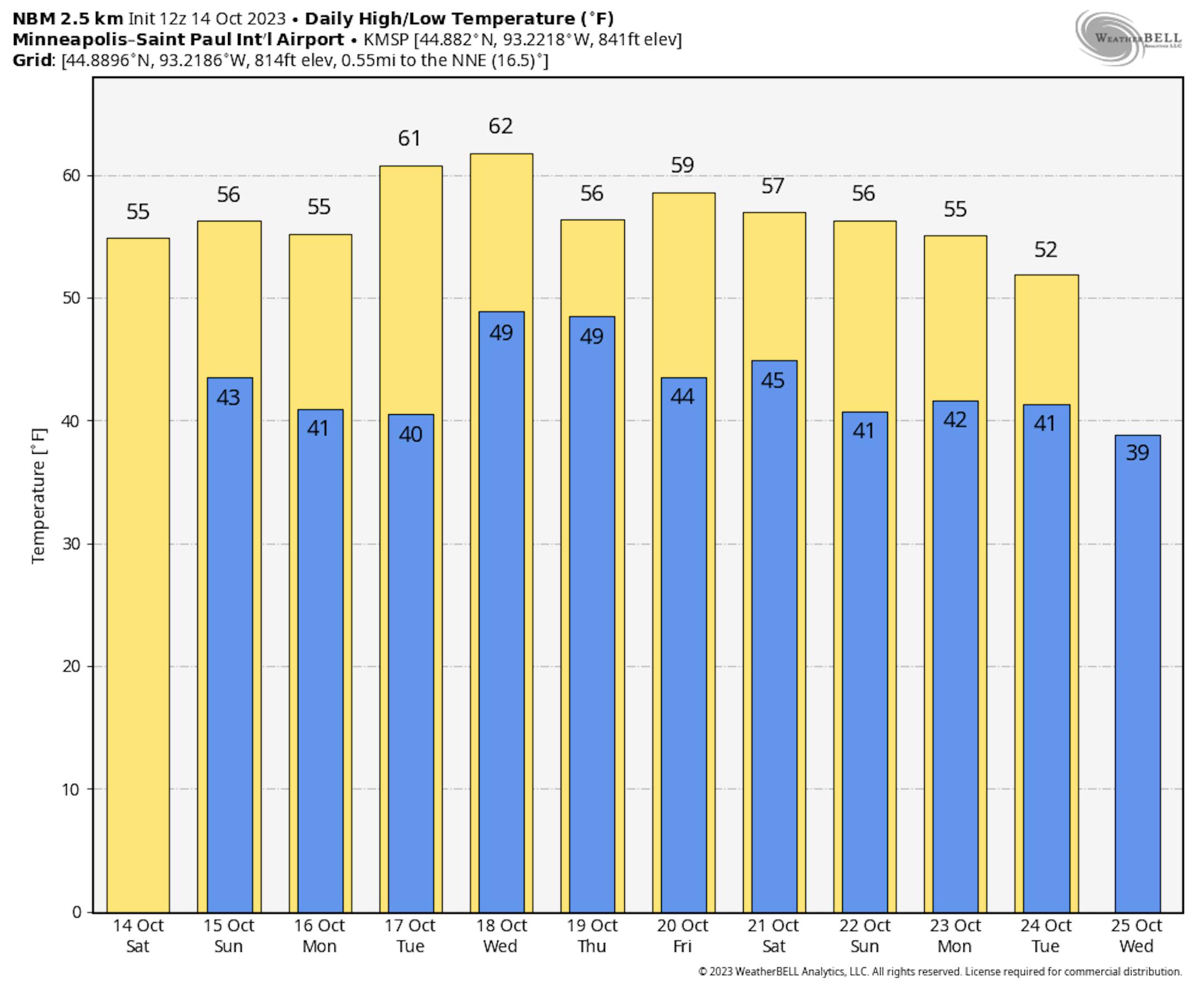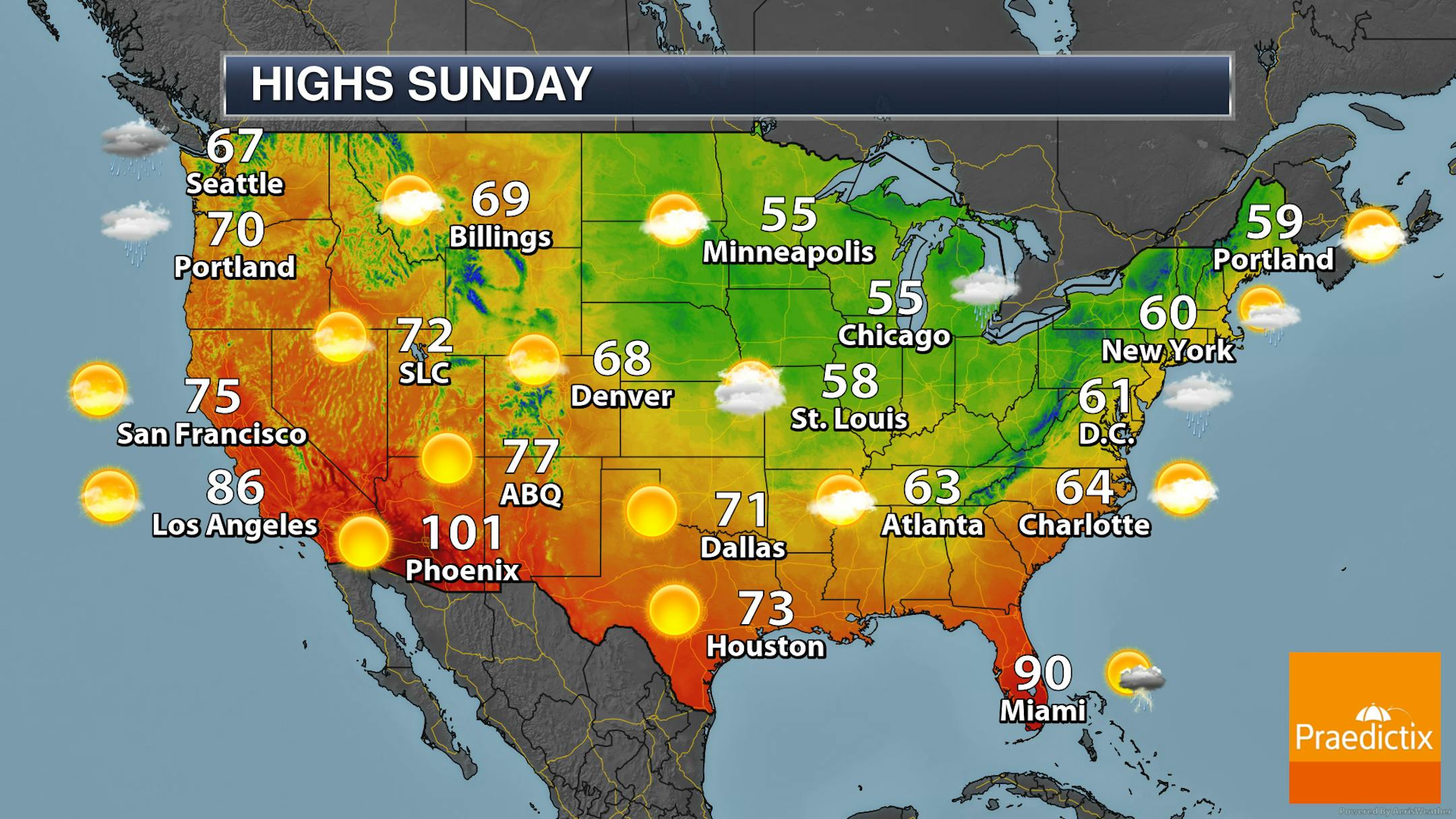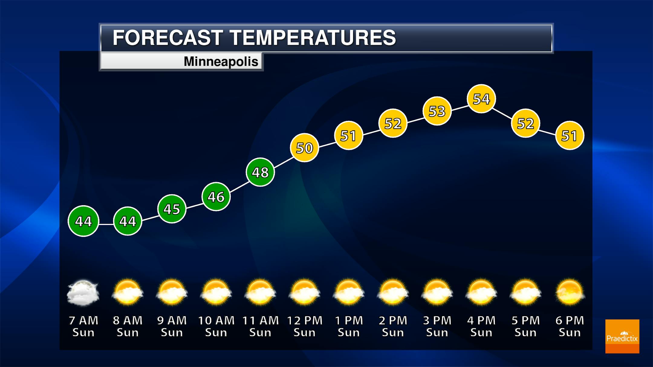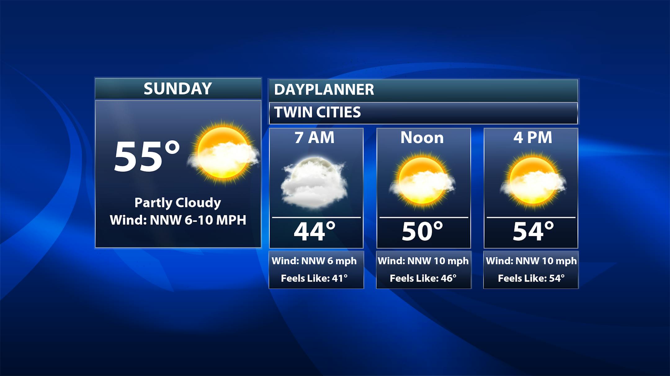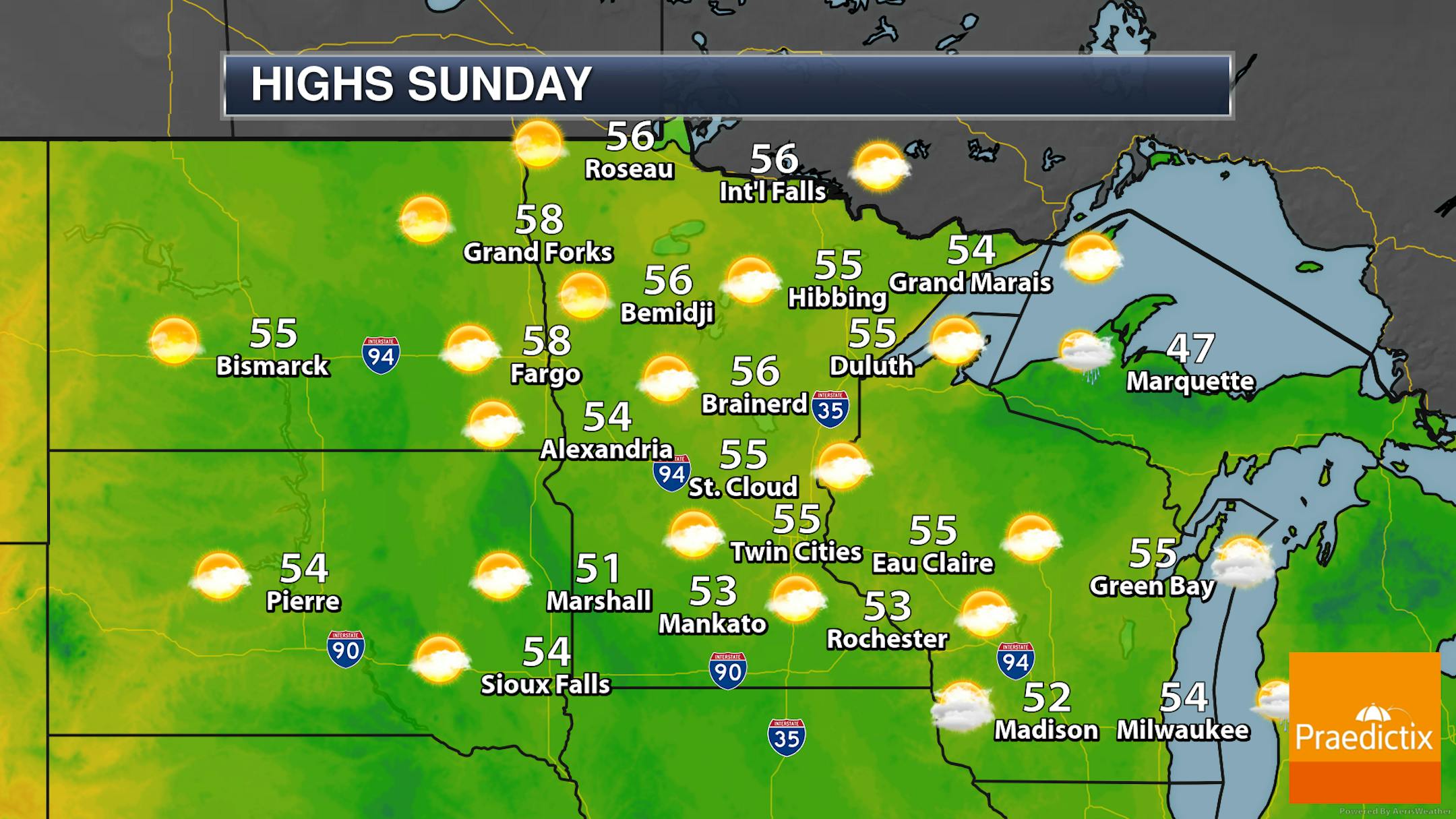 A sun/cloud mix is expected across the state on Sunday, with highs generally in the 50s. These highs are up to 5F above average in northern Minnesota but around 10F below average in southwestern parts of the state.
