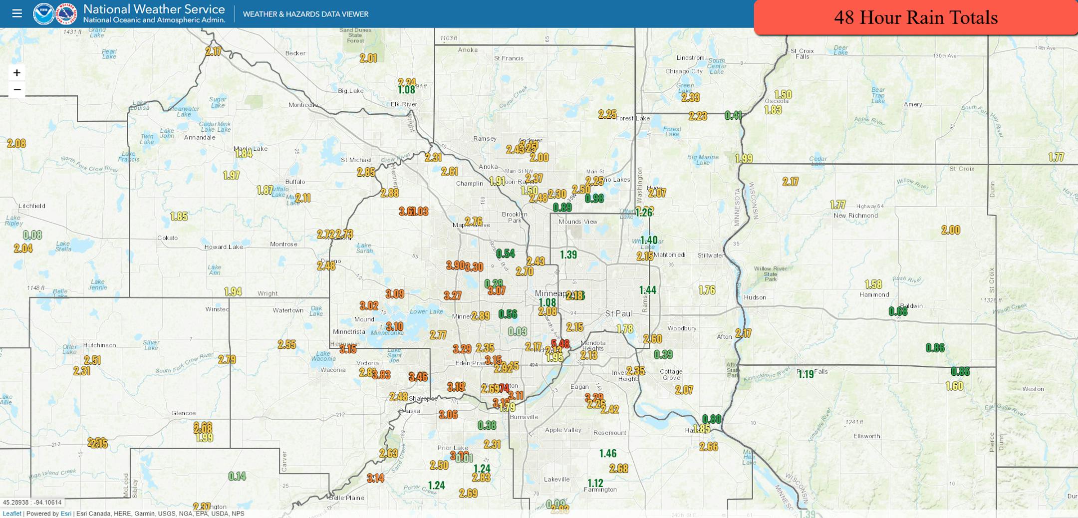 Over the two-day period of rainfall, 1.94" fell at the MSP airport. Heavier rainfall amounts fell across the western and southern metro, with several areas reporting over 3" of rainfall - including 3.45" at NWS Chanhassen.