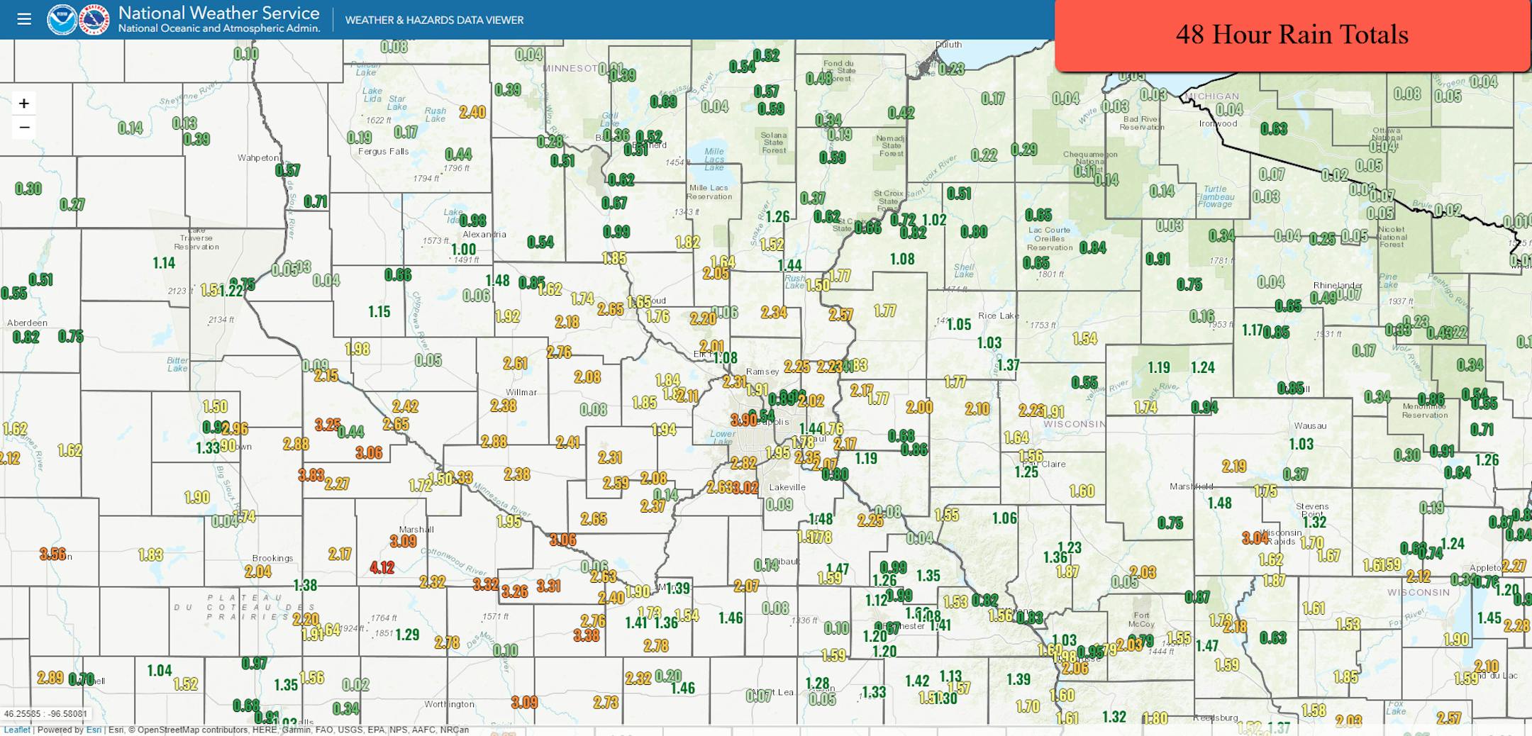 Two-day rain totals of 1-4" fell across central and southern Minnesota as this system moved through the region. Some of the heaviest rain fell from southwestern Minnesota into the west and southern metro.