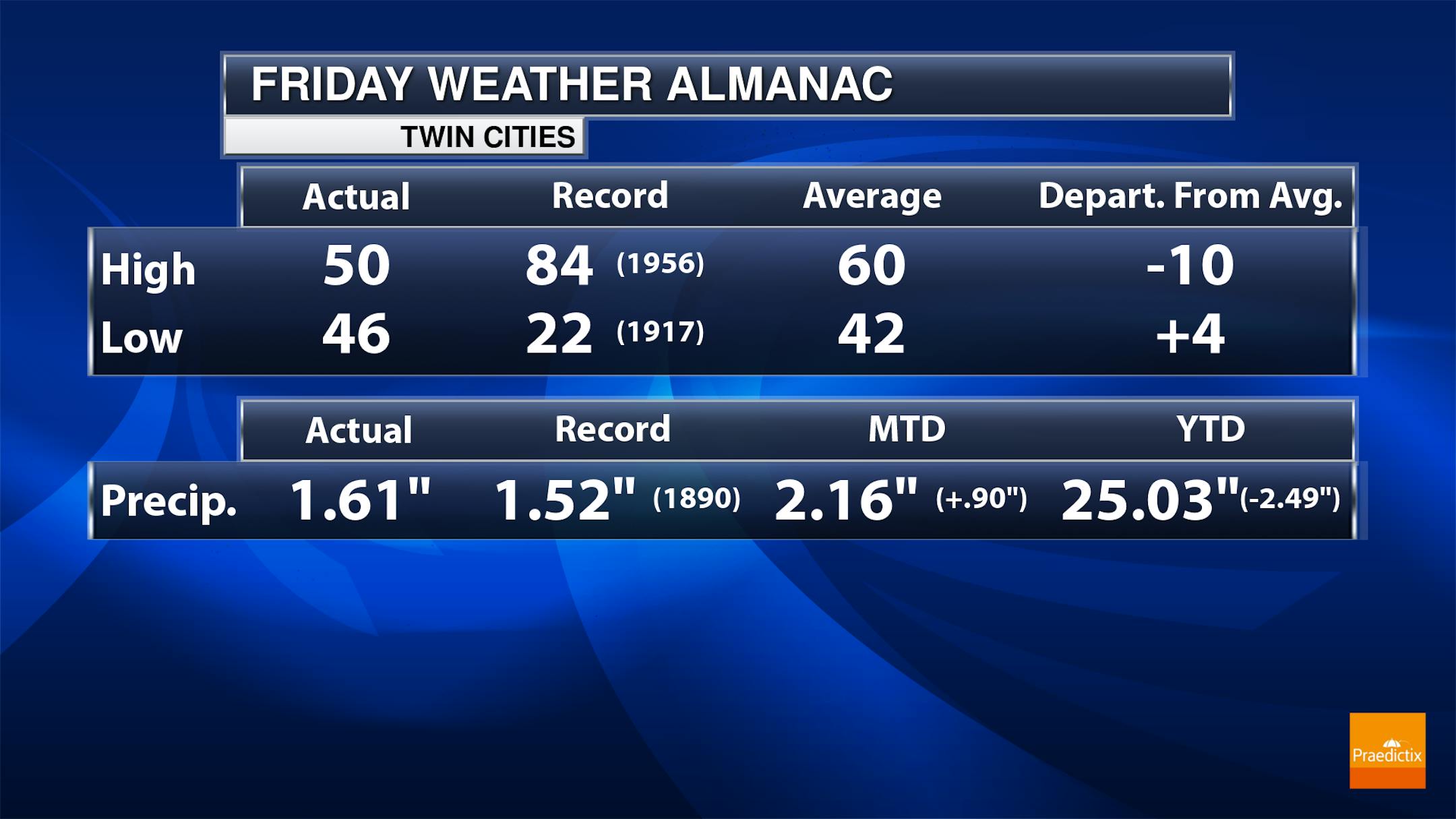 We saw record rain across parts of central and southern Minnesota and western Wisconsin on Friday, with 1.61" falling at MSP. This is where the heaviest rain was focused during the 24-hour period that covers Friday.