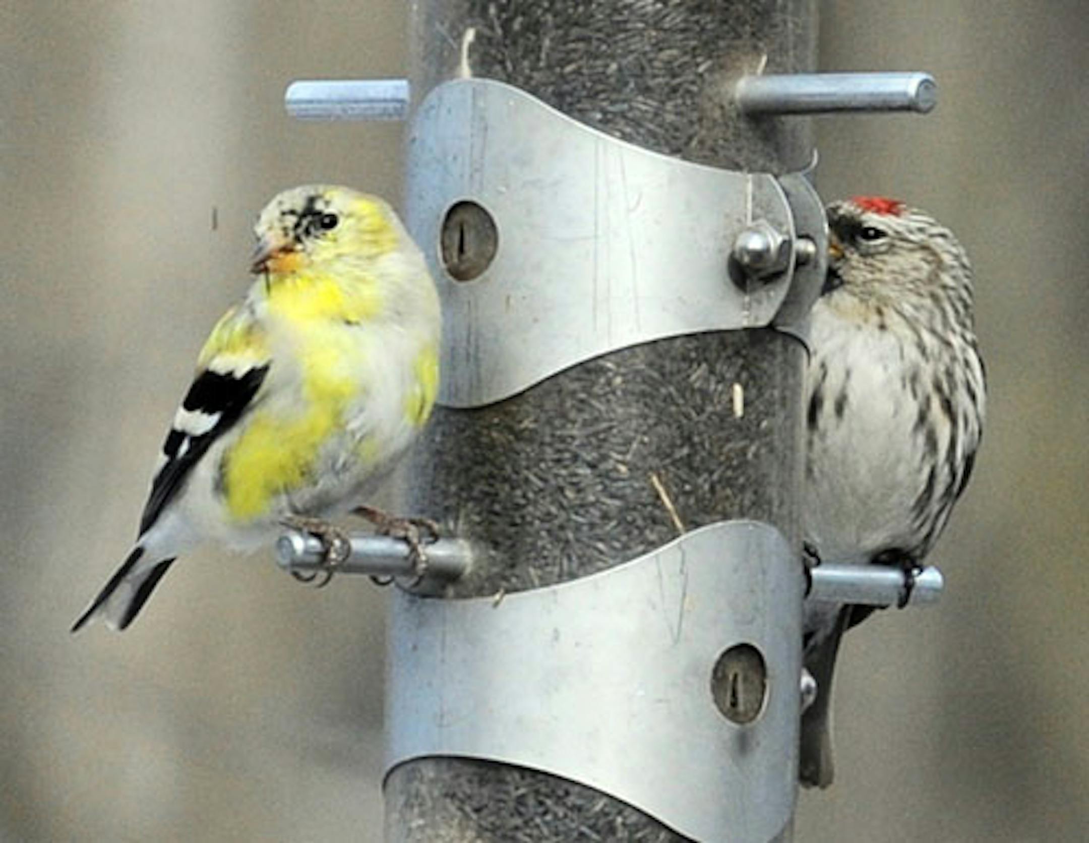 American Goldfinches are rapidly molting into their bright yellow breeding plumage. They were joined here yesterday by two dozen Common Redpolls. We've seen but one this winter.