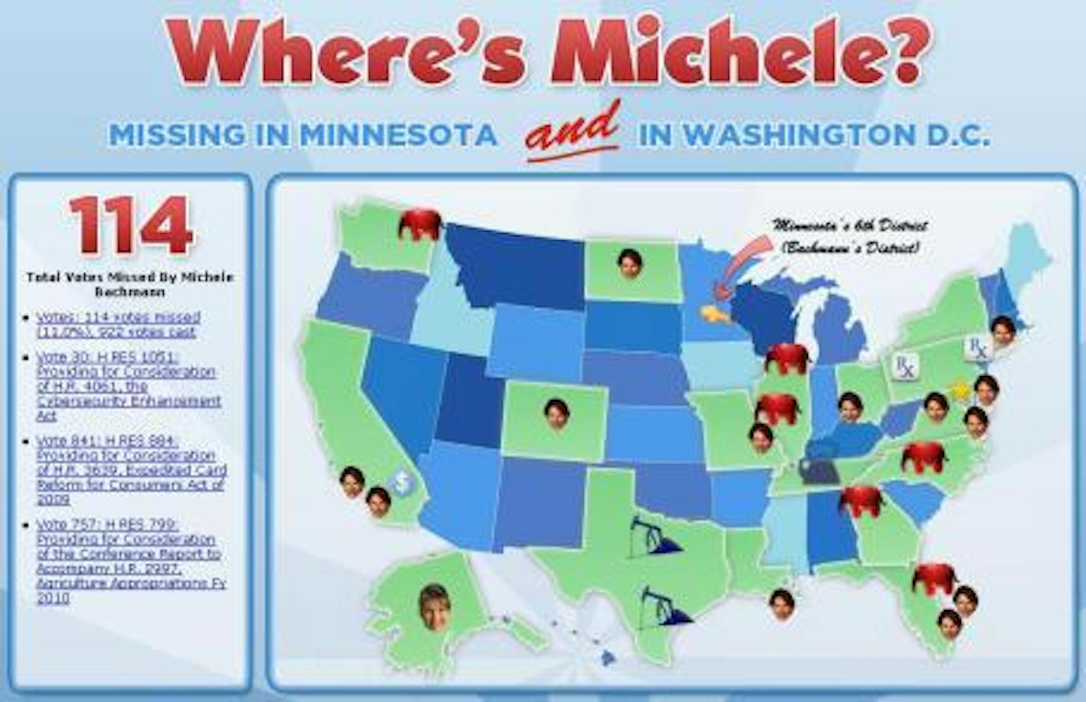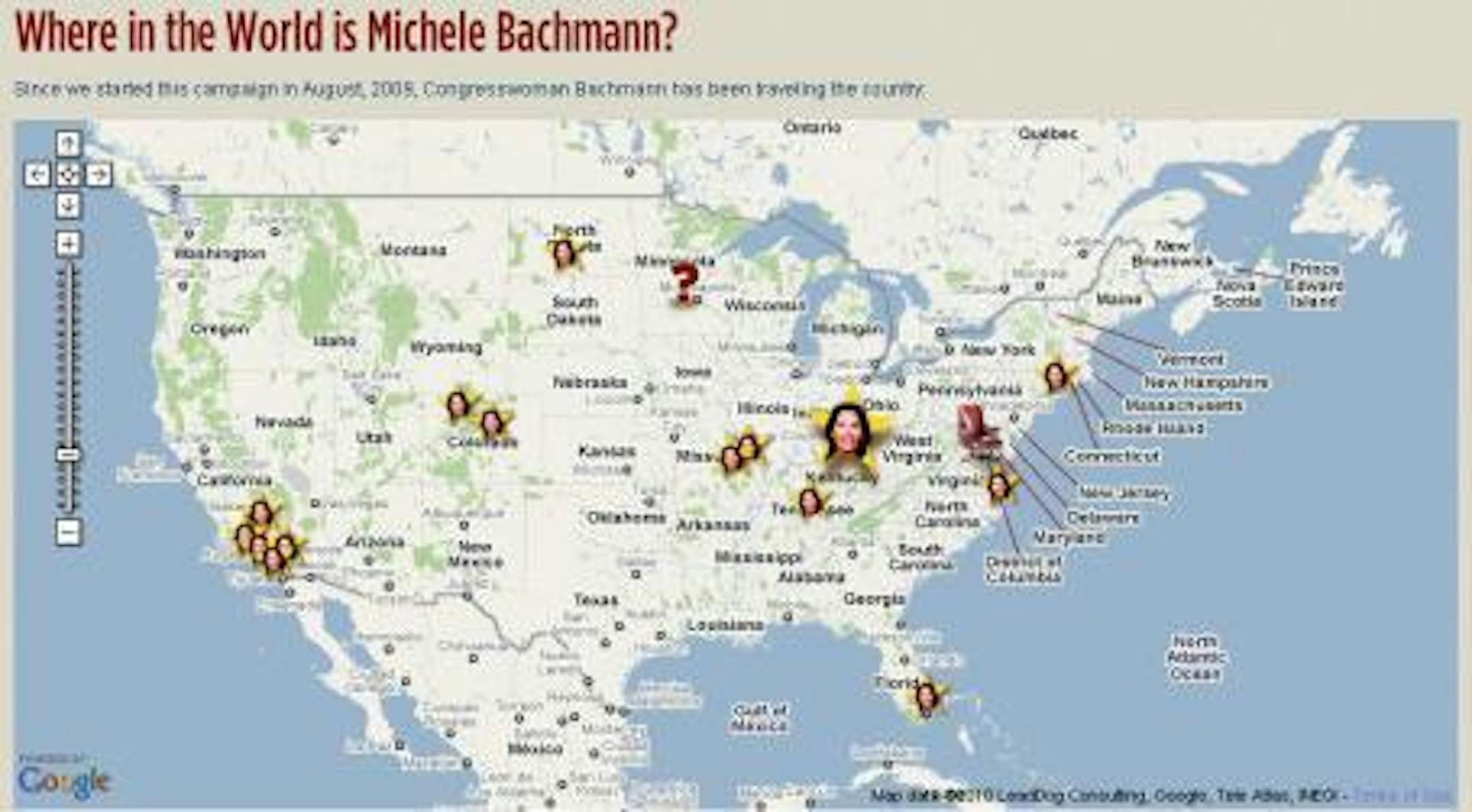 Tarryl Clark and Maureen Reed, both Democrats, have each rolled out maps in the last 24 hours tracking Bachmann's speaking appearances. Reed, who also included national funding, even presented the graphic on a new standalone website: wheresmichele.com.