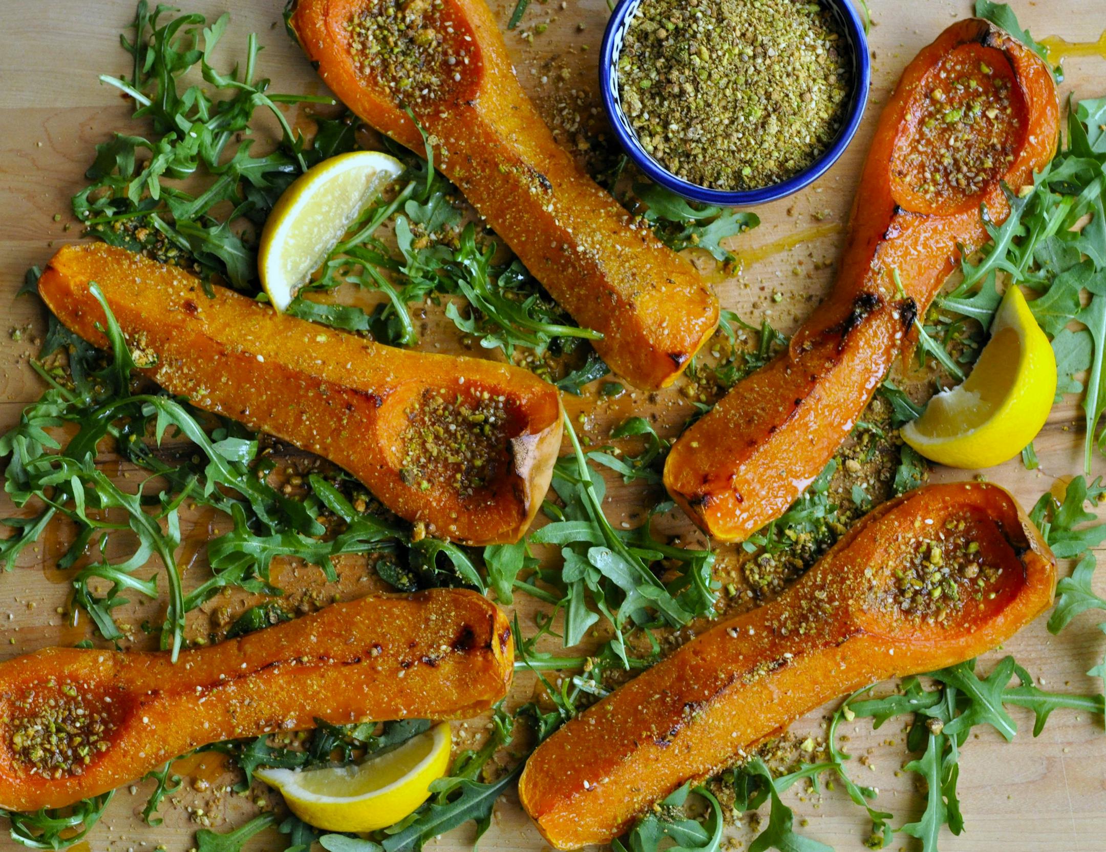 Thick wedges of butternut squash are brushed with a mixture of olive oil and honey and roasted until lightly browned and tender. The wedges are arranged on a bed of arugula, sprinkled with a pistachio dukkah and drizzled with a little more olive oil and honey. Lemon wedges are served alongside it for a bright, acidic note that highlights the flavor of both the squash and the dukkah.
