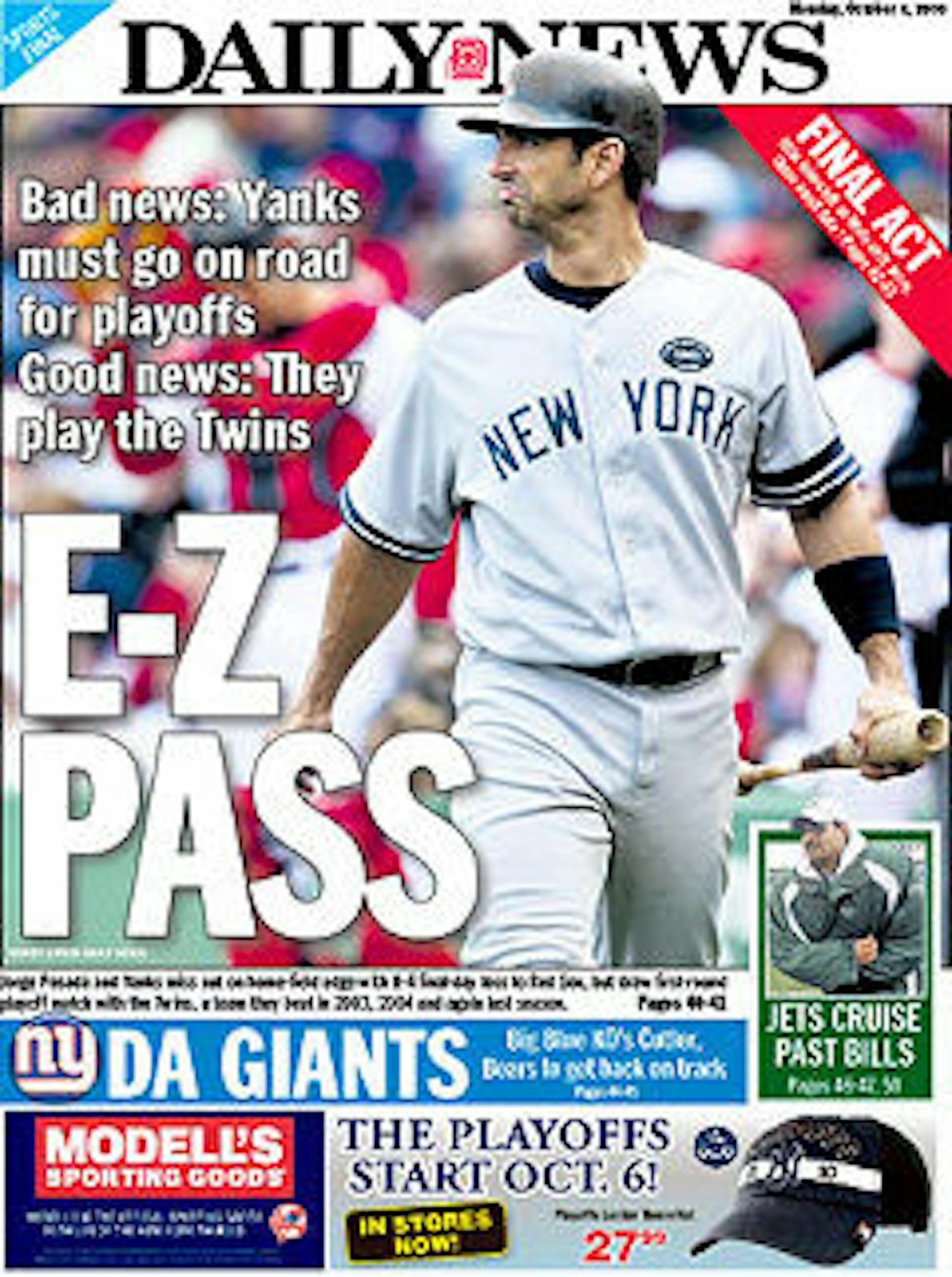 Many Twins fans took exception to the above headline, which appeared on the cover of the New York Daily News prior to the ALDS. The newspaper, known for being outrageous and controversial, was condescendingly declaring the Twins to be no challenge for the Yankees, a sentiment that seemed to echo throughout the Big Apple.