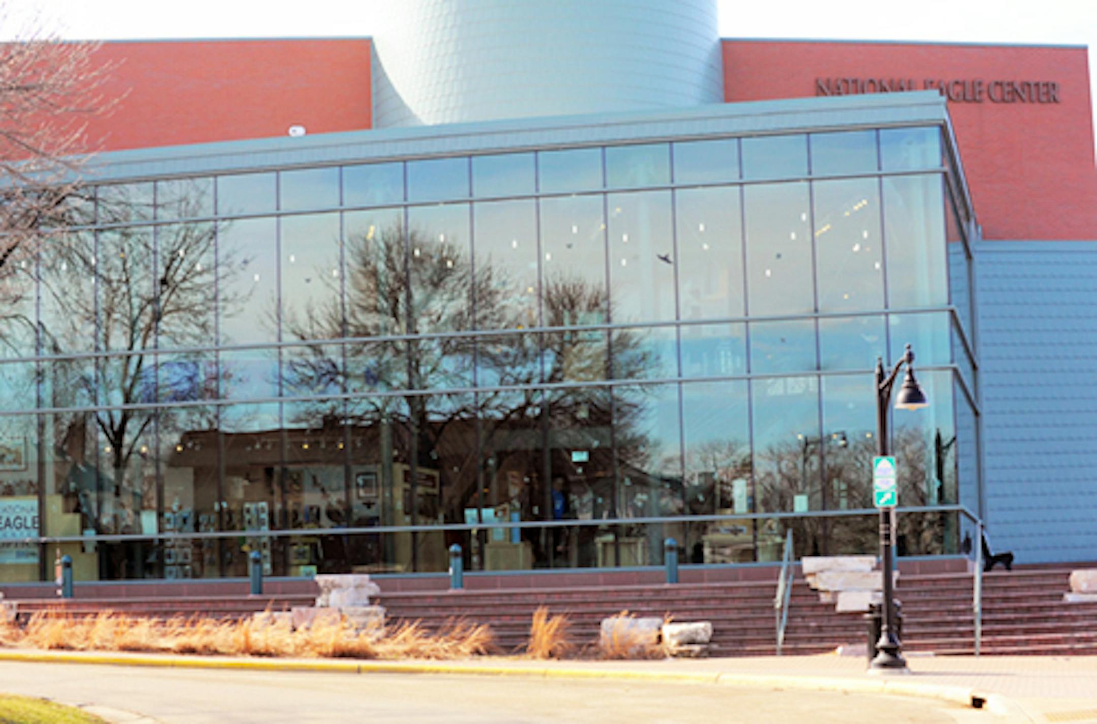 You are looking (photo below) at a wall of glass, the entire south side of the National Eagle Center building in Wabasha, Minnesota. Lots of reflections in what is plain old window glass. The building is 100 feet from the Mississippi River, and faces due south, into the teeth of spring migration.