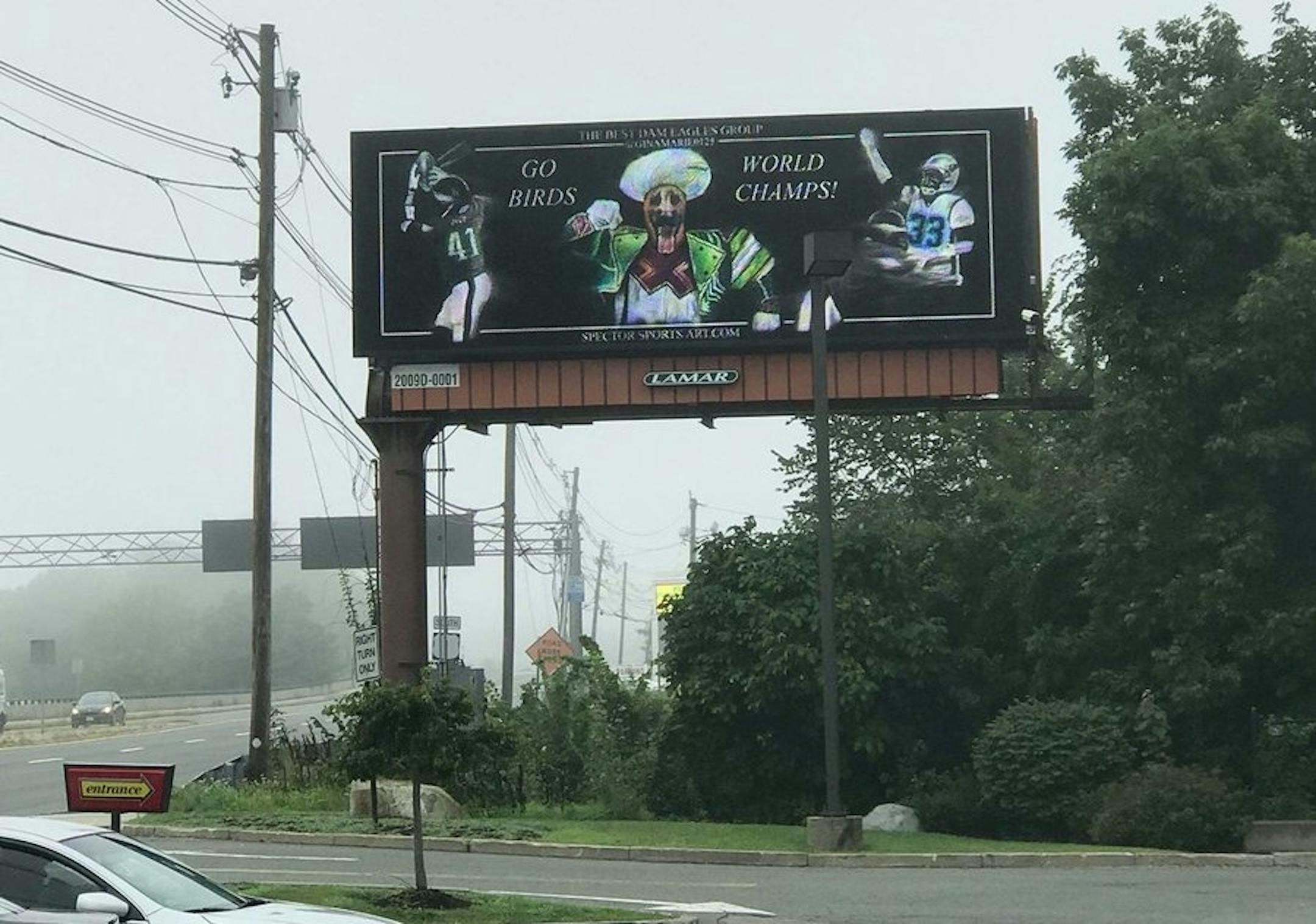 The billboard is positioned on a road traveled by Patriots fans traveling to Gillette from Boston — and they'll pass by it on their way to the stadium Thursday when the Patriots have a preseason rematch with the Eagles. It is slated to be up until early September.