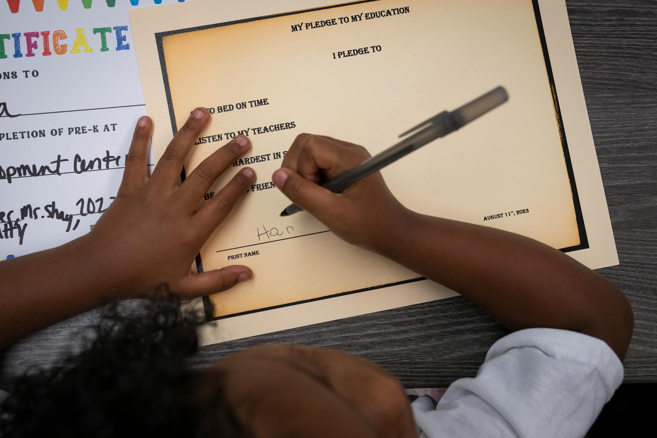The kids all took part in a ceremonial signing of a pledge — to their kindergarten career.