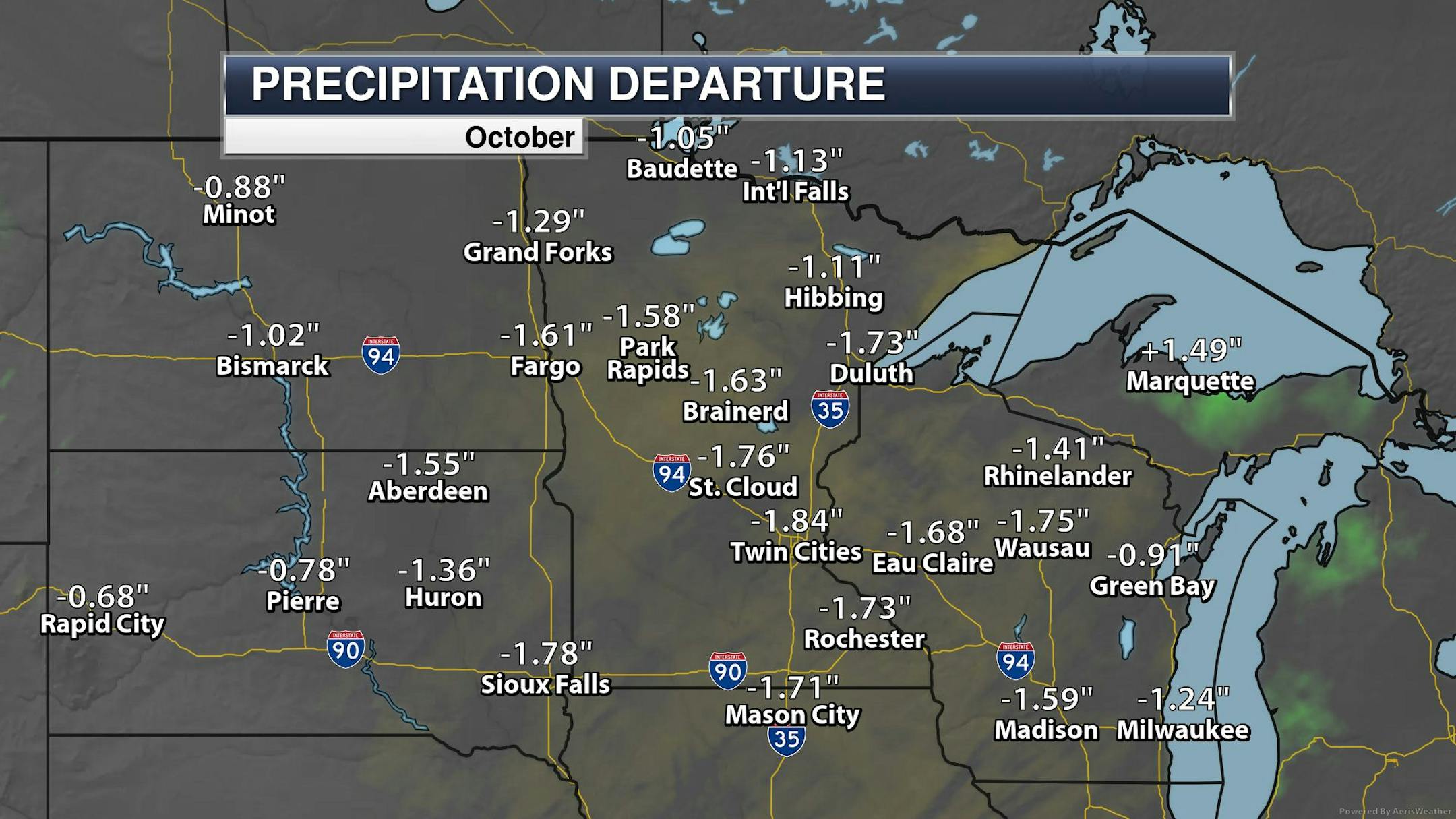 It's been a dry October with many locations nearly 1" to 2" below average for the month of October.