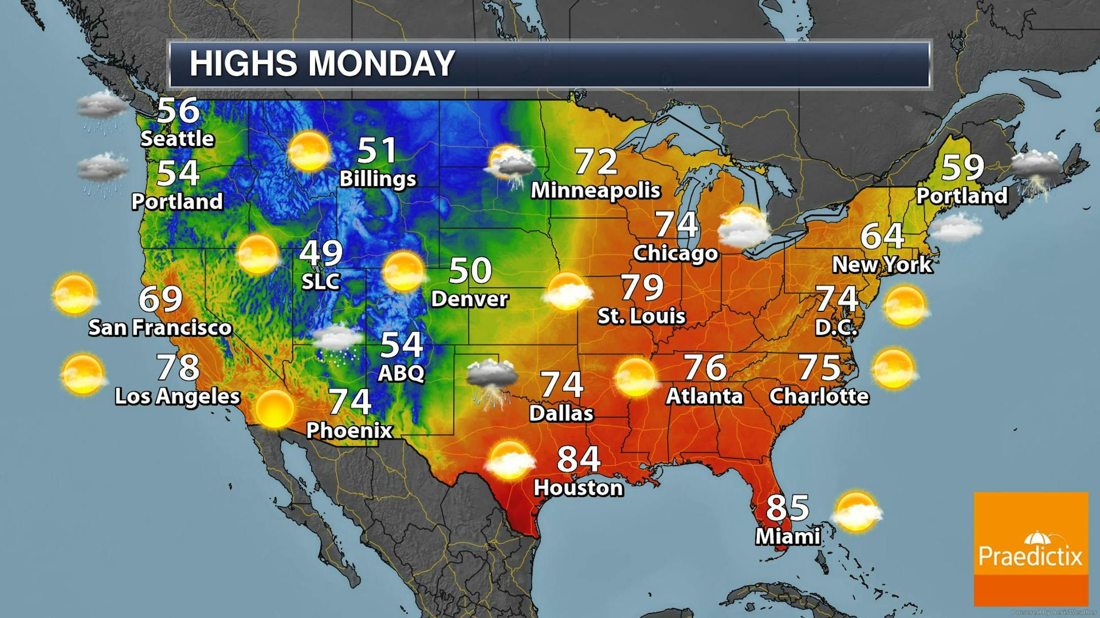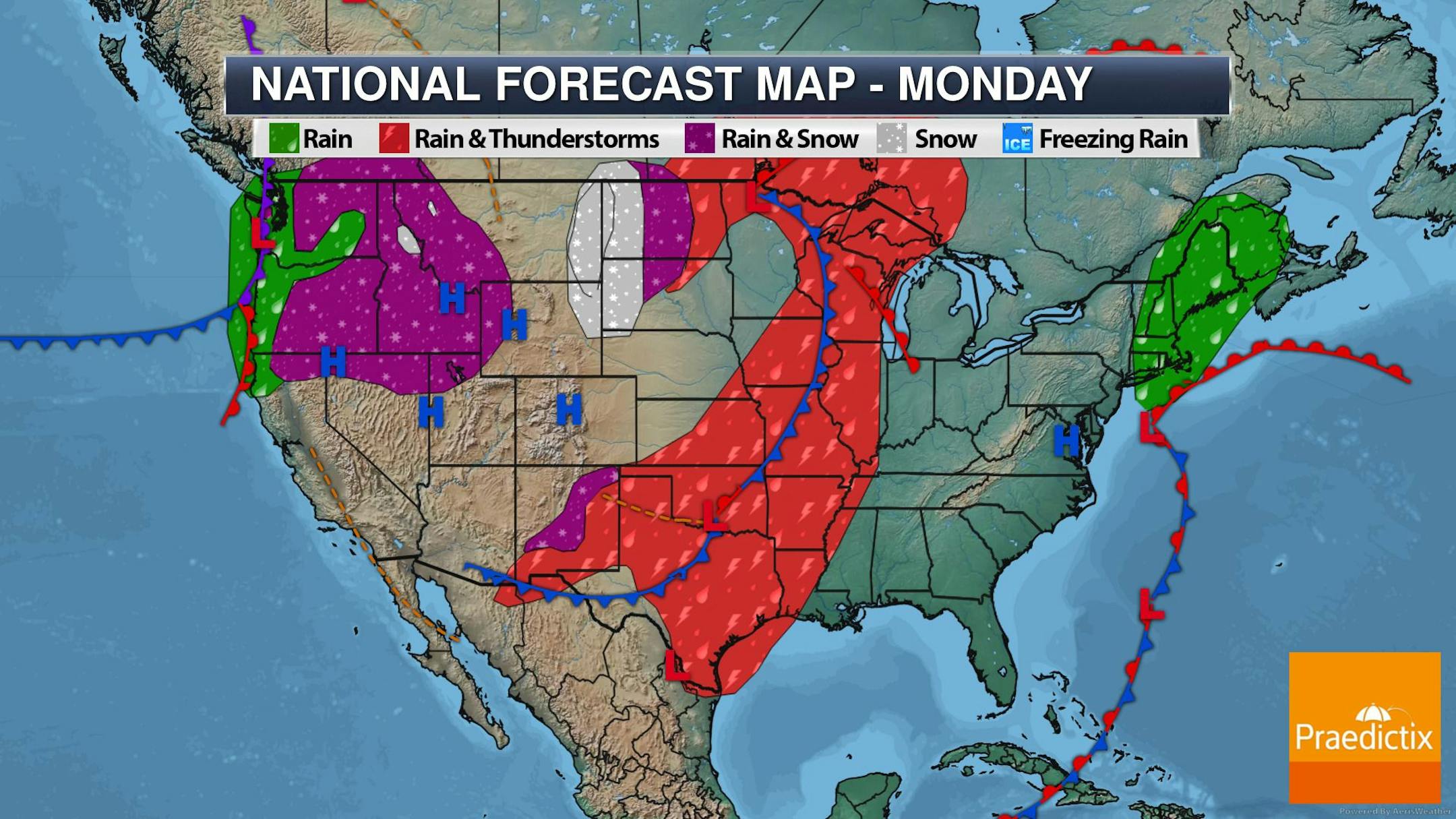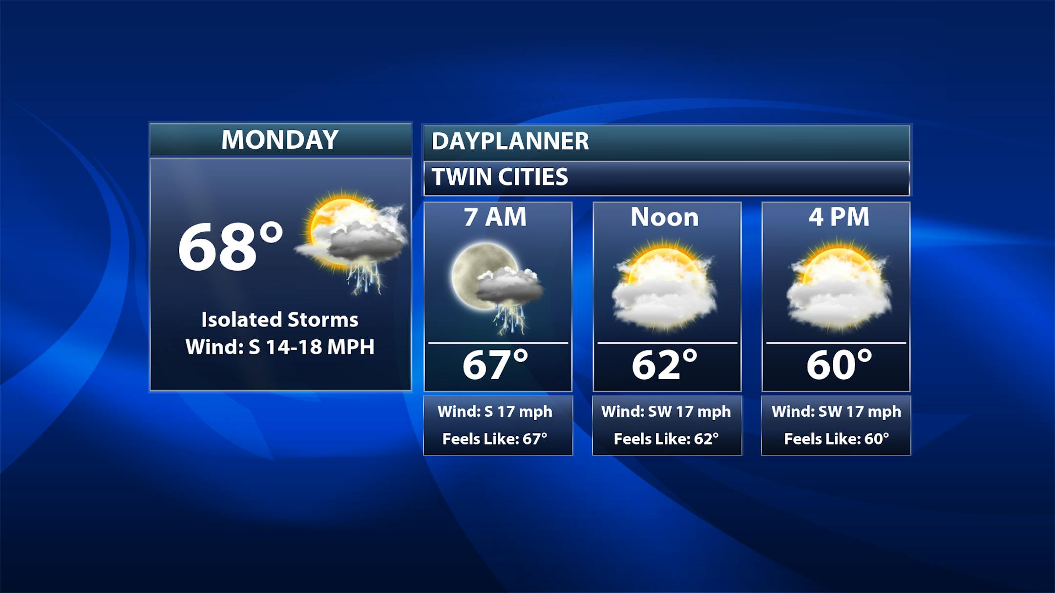 Here's the weather outlook through Monday, which shows isolated showers and storms across the Upper Midwest through the day.
