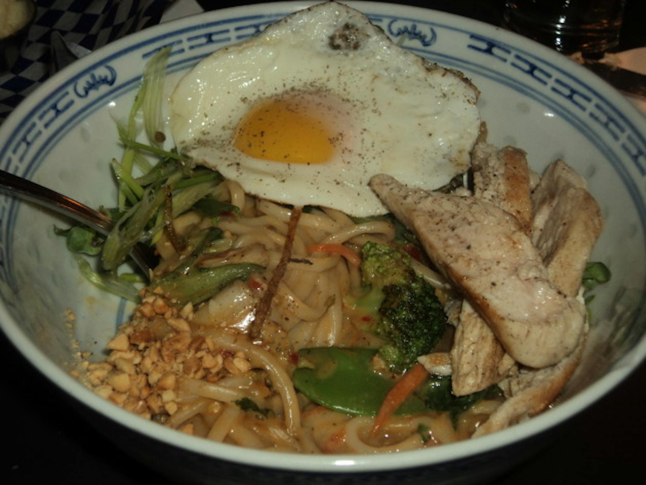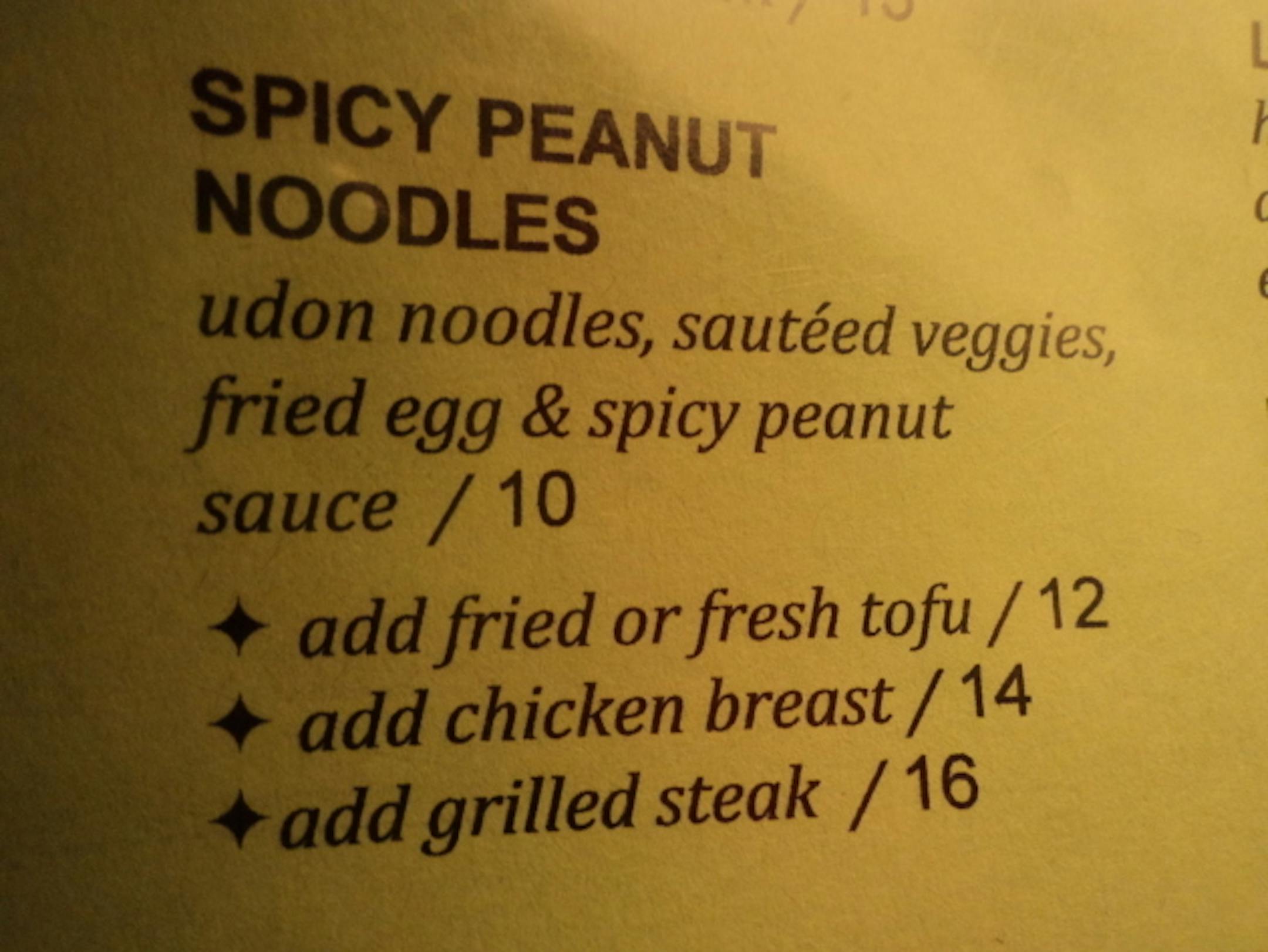 While the menu had a lot of really creative dishes, making a decision was not difficult for me. Blackbird Cafe had a dish on their menu that sang melodies to my heart. Spicy peanut noodles: udon noodles, sauteed veggies, fried egg & spicy peanut sauce... add chicken.