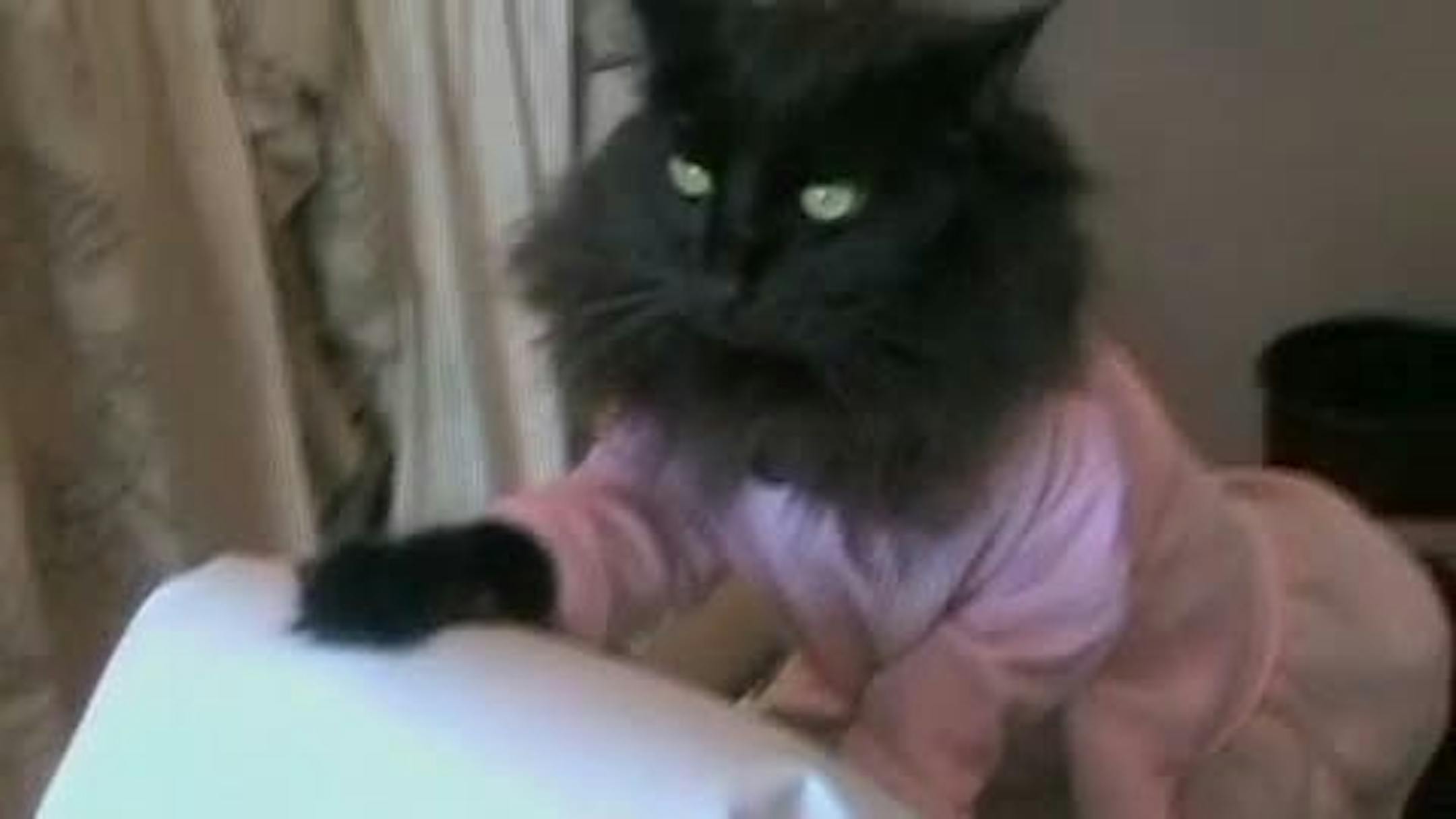 "I put her in onesies [and other garments, one a handmade number that includes what I'd describe as ear hats] for protective reasons. Your little friend, baby Merci, likes to nip at her. And not just nip, he takes out big chunks her fur -- looks like he's got a Robert Goulet mustache -- and he looks at me like, Huh? I didn't bite her."