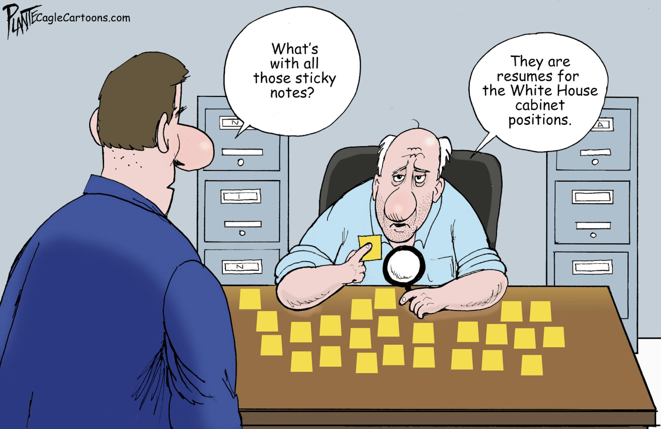 A MAN INSPECTS STICKY NOTES ON A TABLE, CABINET, POSITIONS, WHITE HOUSE, RESUMES,, INEXPERIENCED, UNQUALIFIED, PRESIDENT ELECT, DONALD J. TRUMP, PROBLEMATIC, RNC, MAGA, GOP, REPUBLICAN PARTY, CONTROVERSIAL (Bruce Plante/Cagle Cartoons)