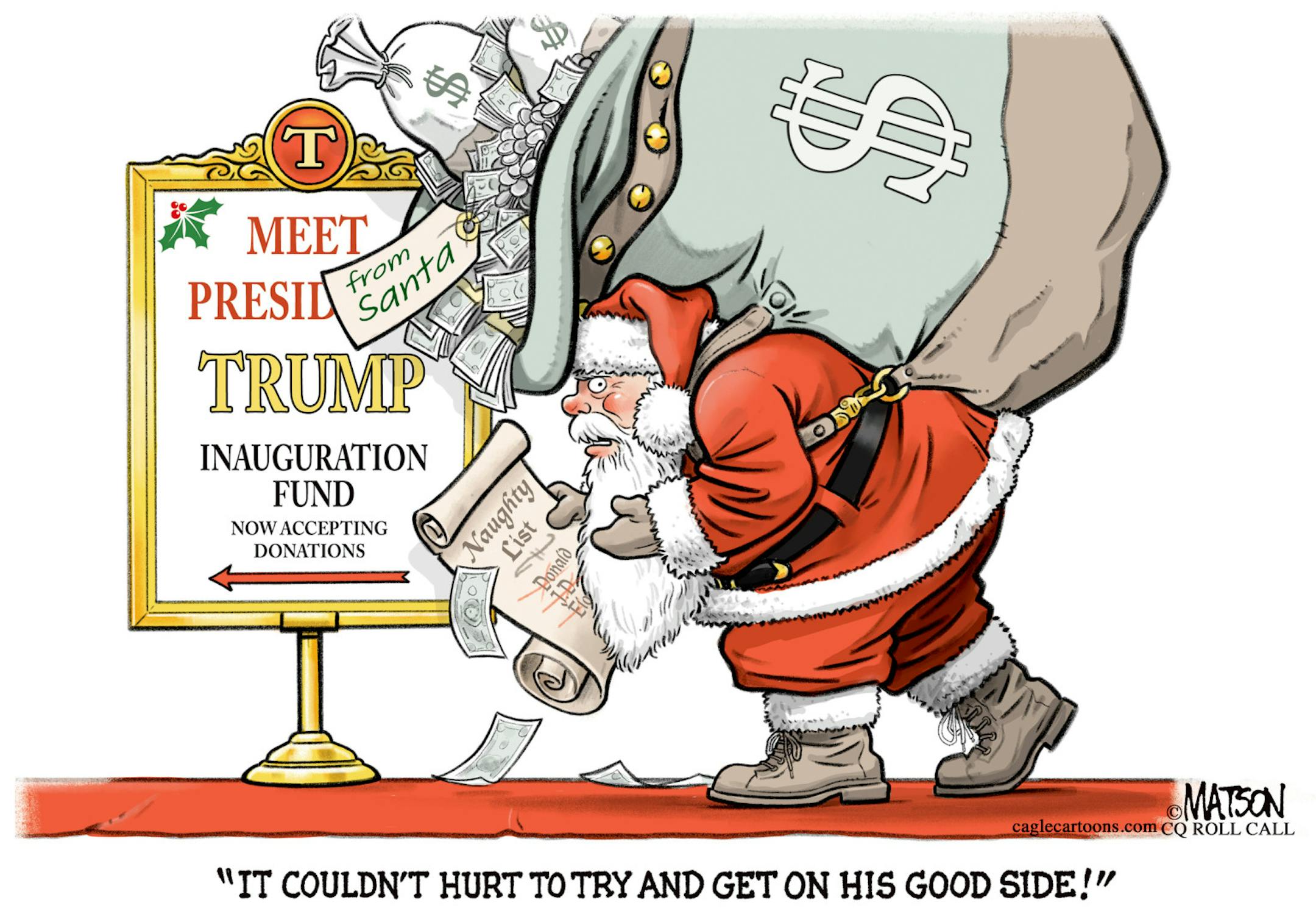 Editorial cartoon: R.J. Matson on Santa donating to Trump