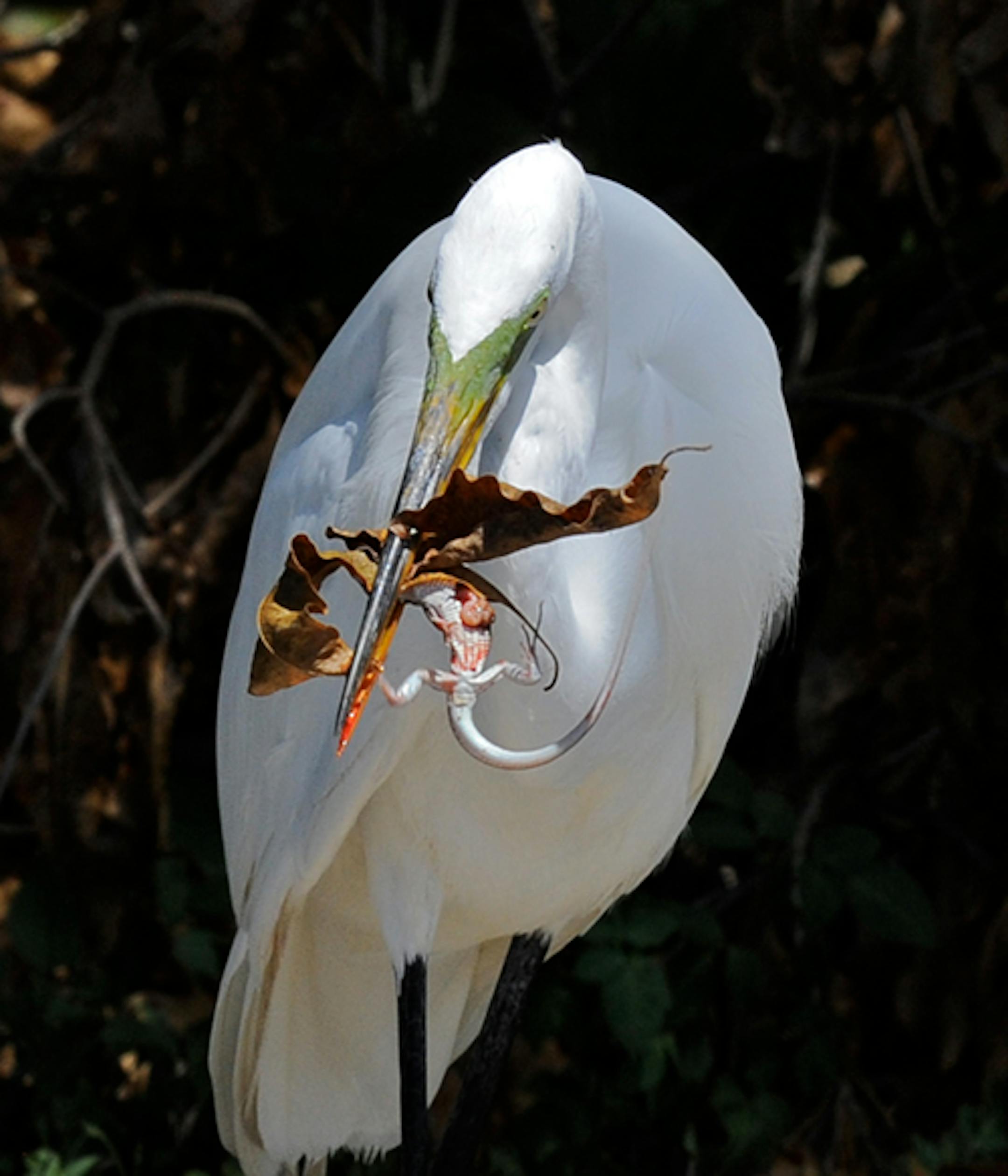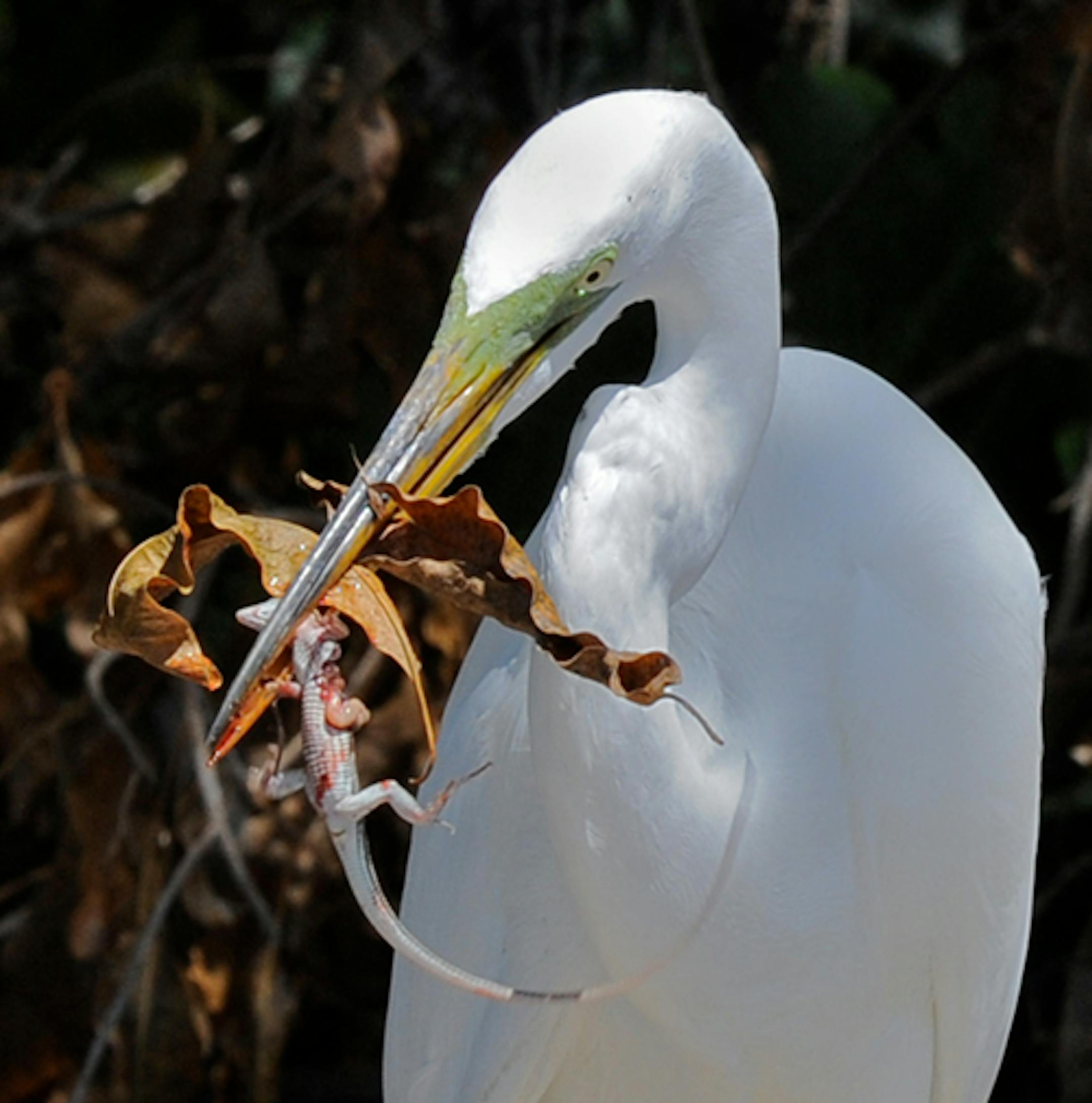 This Snowy Egret was hunting lizards in Ding Darling National Wildlife Refuge during a recent visit. I watched the bird from our car as it walked a wood edge, its head pointed into the brush. The bird moved slowly, with purpose. At times it began to sway its body, almost like a slow dance. This happened when something in the brush caught its interest. When the bird stopped advancing and seemed to focus more intently, it moved its head and neck in a wave pattern, undulating slowly as it extended the neck. The capture movement was too quick to follow. The bird shook the vegetation loose, and ate its prey. I have no idea what the body and head/neck motions meant unless they were to confuse or distract the lizard. The next day, in roughly the same location, I watched another Snowy, perhaps the same bird, on another hunt, everything similar to Day One except success as I watched.