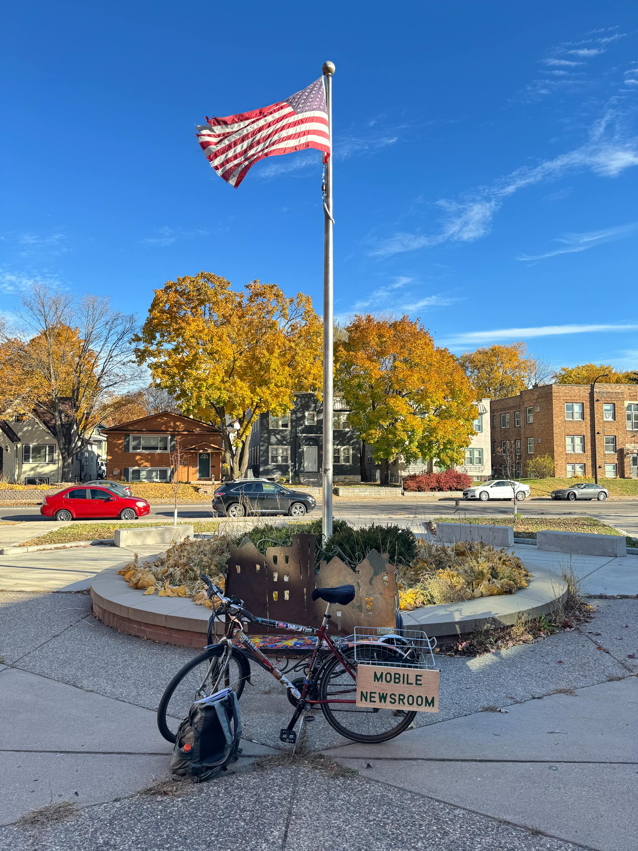 So I set out to find as many of them as I could on Tuesday — to understand what’s really going on in the Minneapolis zeitgeist. The plan was fairly simple: bicycle to one precinct in all 13 wards of the city. For added flavor, I crafted a “Mobile Newsroom” wooden sign to hang off my bike at each stop.