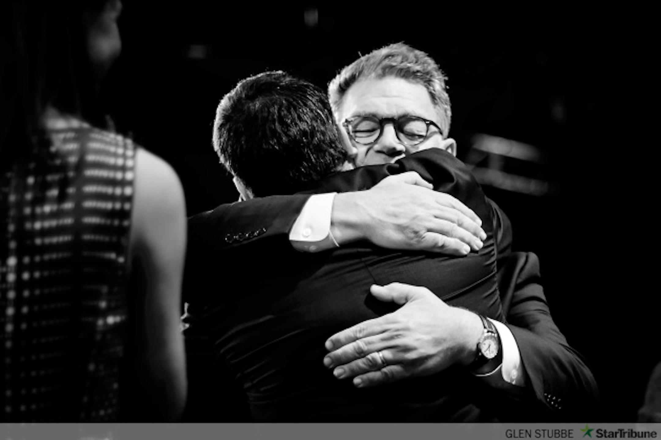 Senator Al Franken hugged his son Joe after speaking to the gathered crowd.