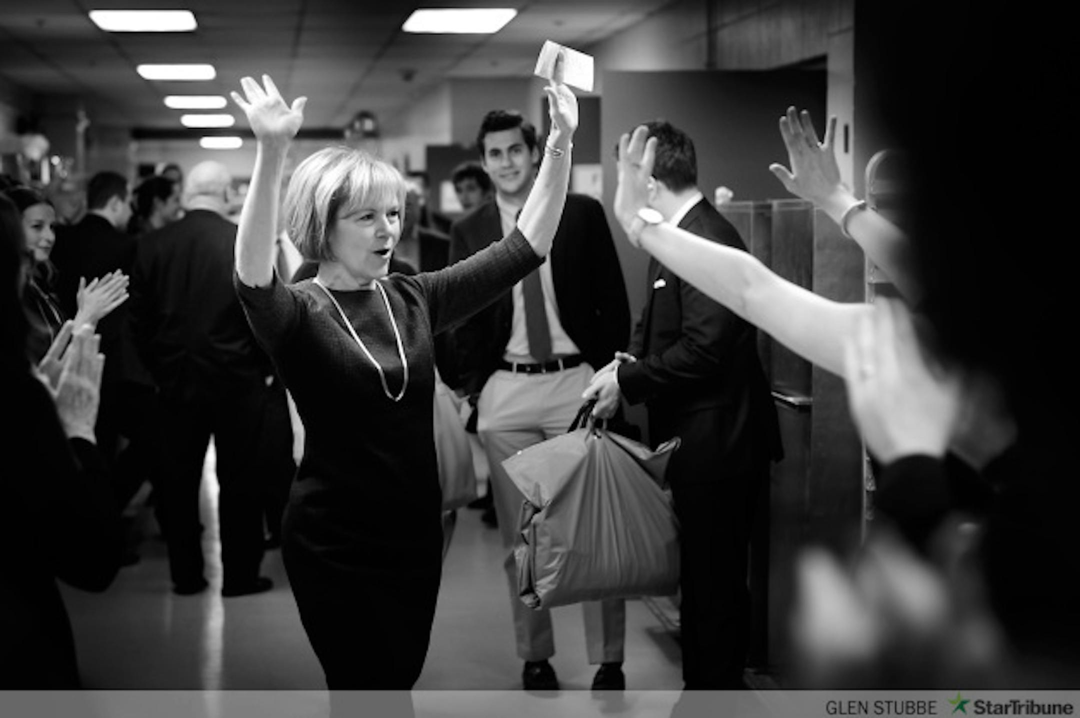 Lt. Governor-elect Tina Smith hit Al Franken's daughter Thomasin with a high five backstage.