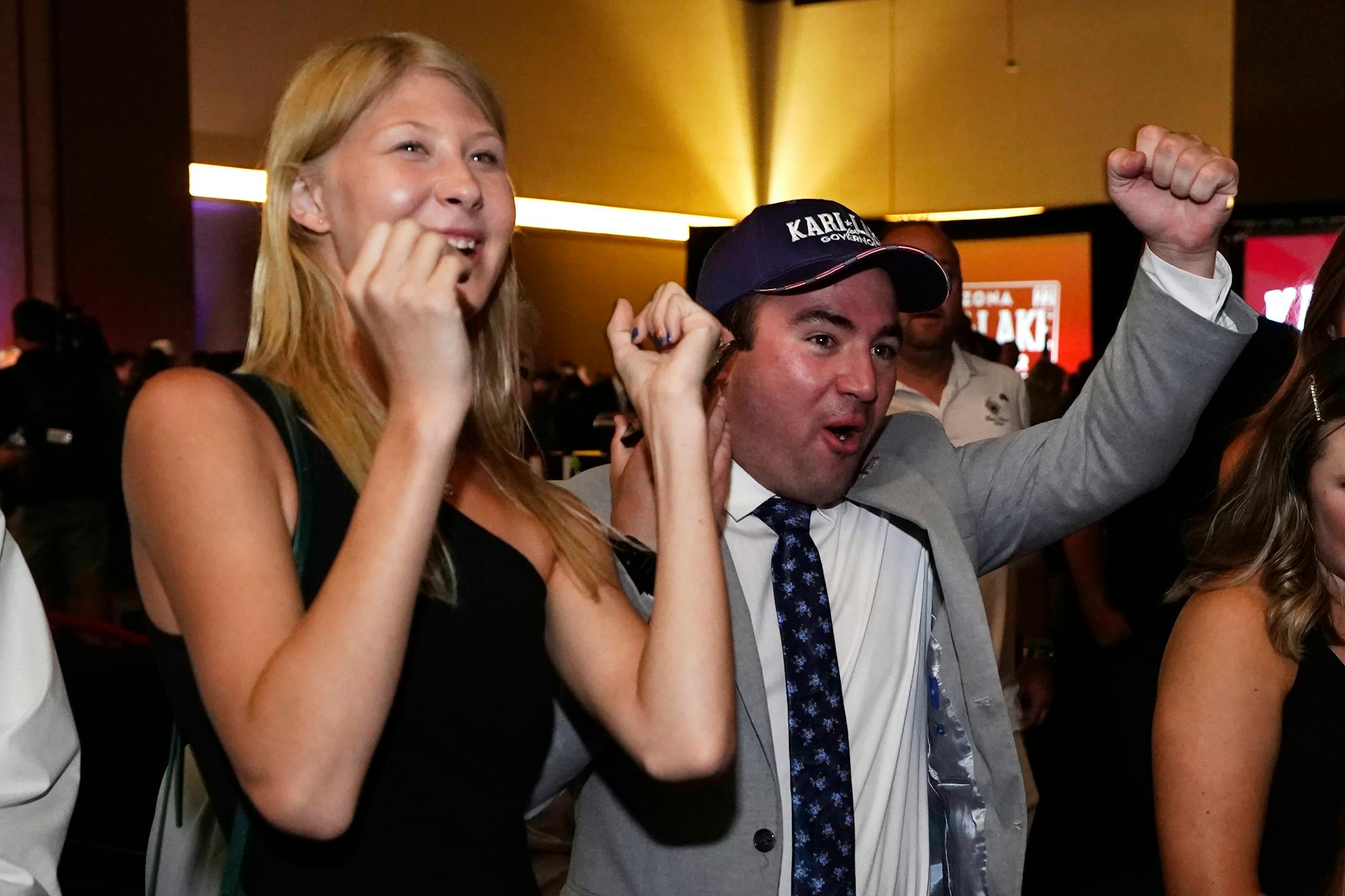 In Arizona, Trump's choice for Senate, Blake Masters, won a crowded primary, as did his pick for secretary of state, Mark Finchem, an election denier who has publicly acknowledged his affiliation with the far-right Oath Keepers militia group. By Wednesday morning, Trump's pick in the governor's race, Kari Lake, had taken a narrow lead over Karrin Taylor Robson, the candidate backed by Mike Pence, his former vice president.