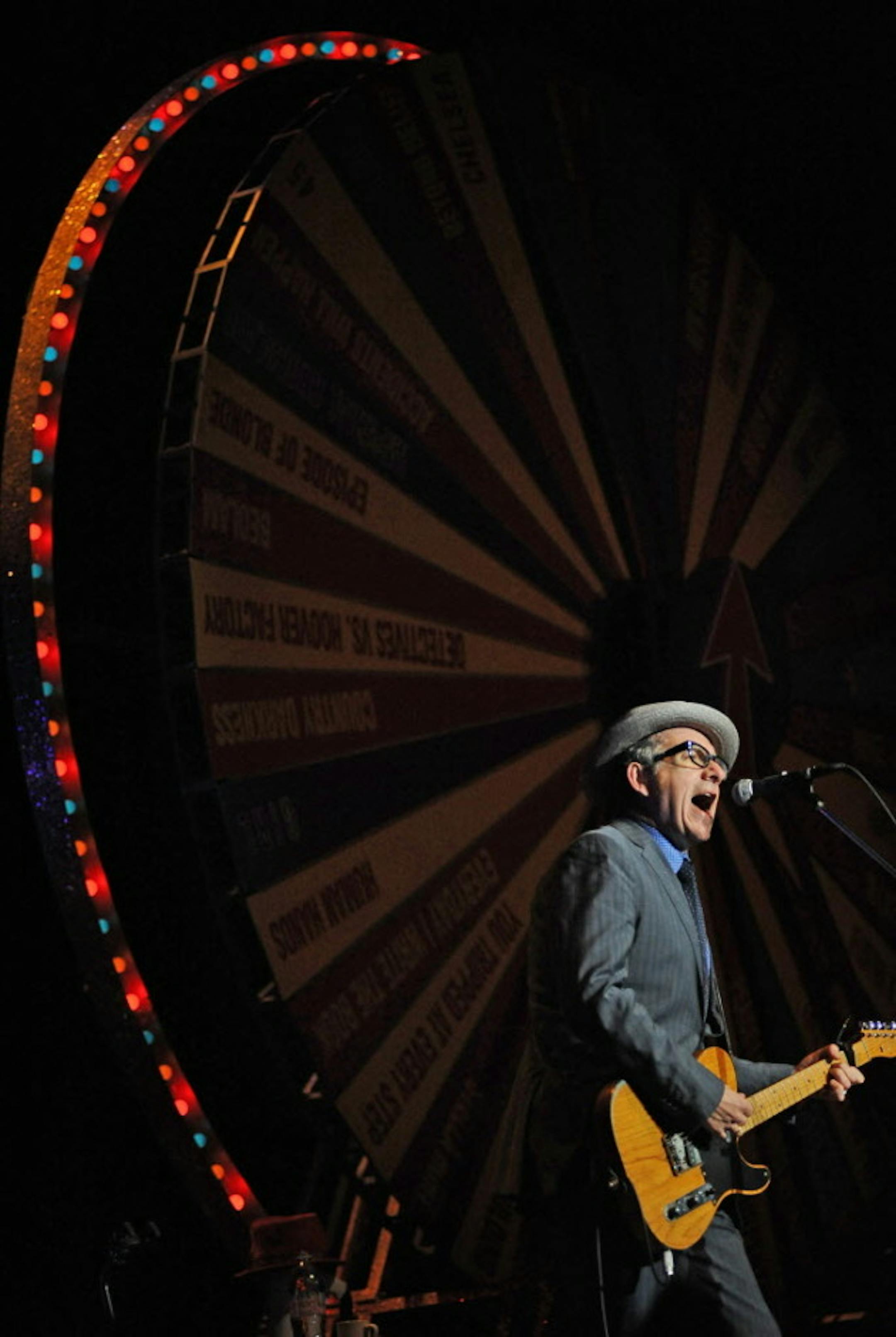 Reprising a tour concept from 1986 (that never came to the Twin Cities), Costello's Spectacular Spinning Wheel — which was almost three times taller than Elvis — featured 40 spaces. There were 32 specific songs, three jokers (spinner's choice) and five topics (such as "time," for songs with time in the title, and "joanna," which Elvis said is Cockney slang for piano, hence it was pianist Steve Nieve's choice).