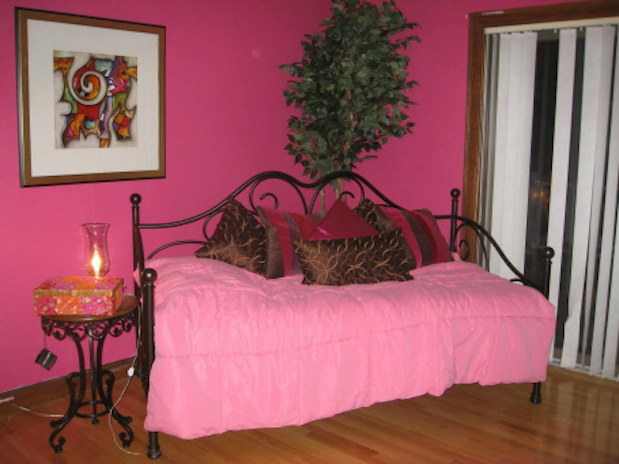 Money was tight, with college costs now in our budget, but I had time to hunt for bargains. The white bunkbed was replaced with a bronze-y iron daybed. New occasional tables and wall art added some grown-up flair. I repainted the room in hottest pink, her favorite color.
