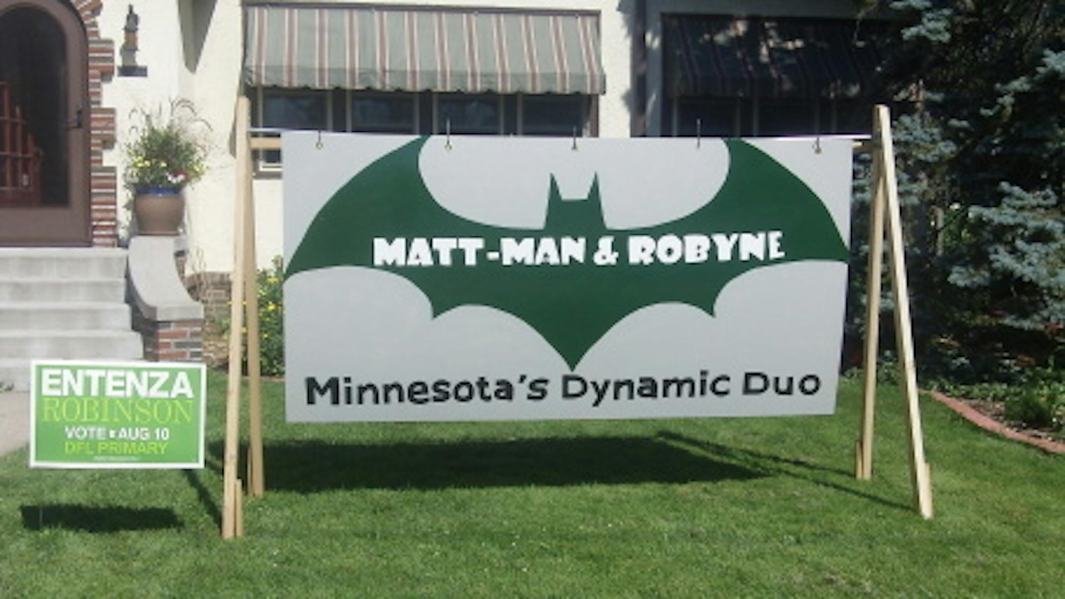Entenza supporter puts up "MATT-MAN AND ROBYNE" sign.
