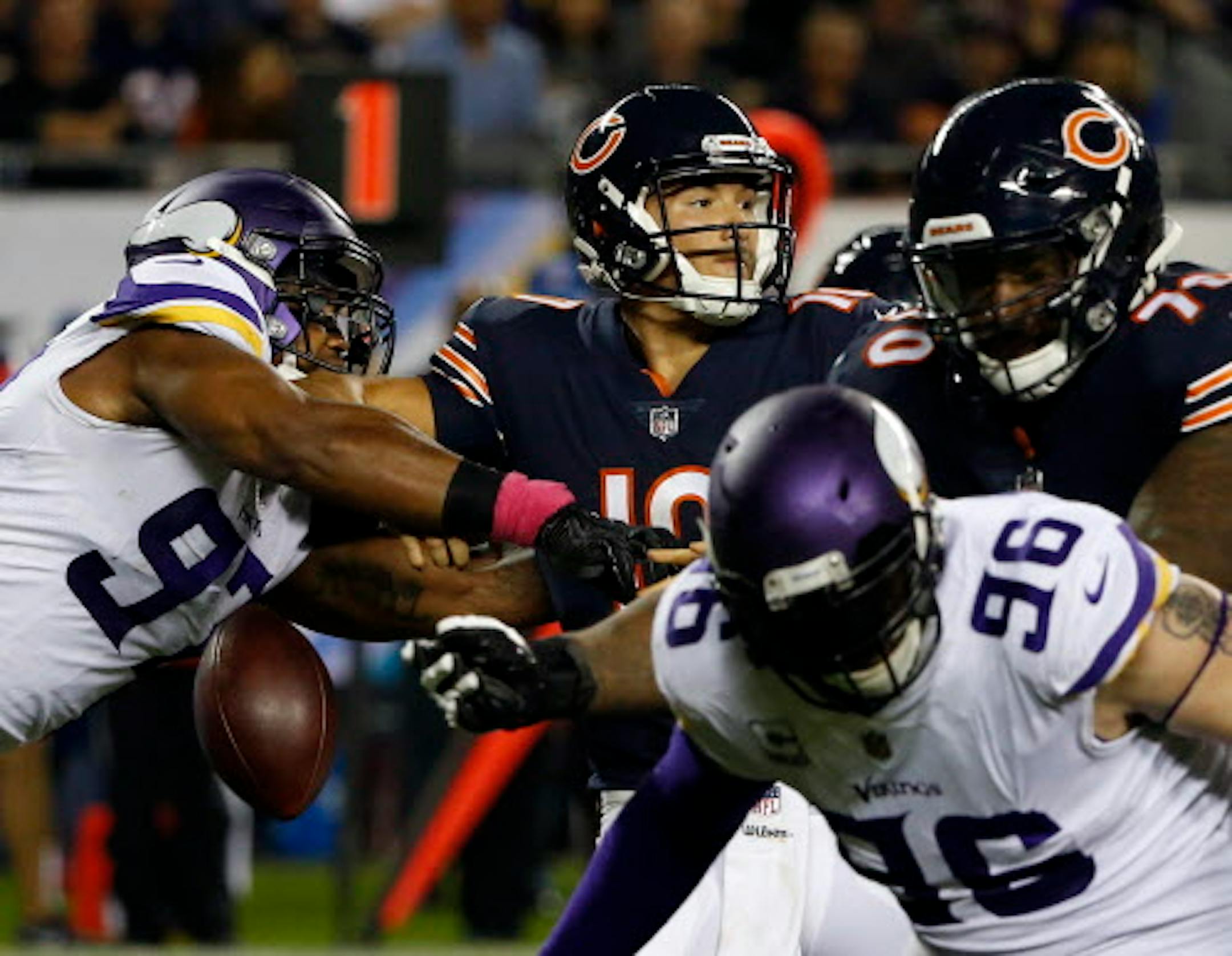 Minnesota Vikings defensive end Everson Griffen (97) strips the ball from Chicago Bears quarterback Mitchell Trubisky (10) during the first half of an NFL football game, Monday, Oct. 9, 2017, in Chicago. (AP Photo/Charles Rex Arbogast)Everson Griffen's streak of consecutive games with a sack is on hold. The Vikings' defensive end is inactive for Sunday's game against the Washington Redskins.