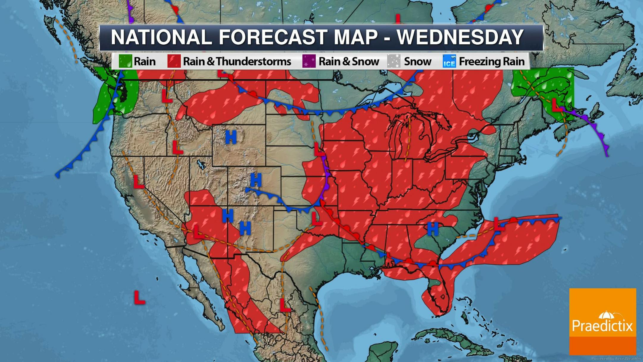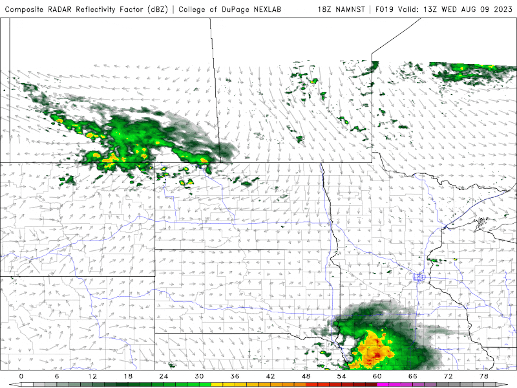 The simulated radar from AM Wednesday to PM Thursday shows more unsettled weather moving through the region. Spotty showers and storms will be possible late Wednesday and once again late Thursday. Some of the storms Thursday night could be a little on the vigorous side with locally heavy rainfall.
