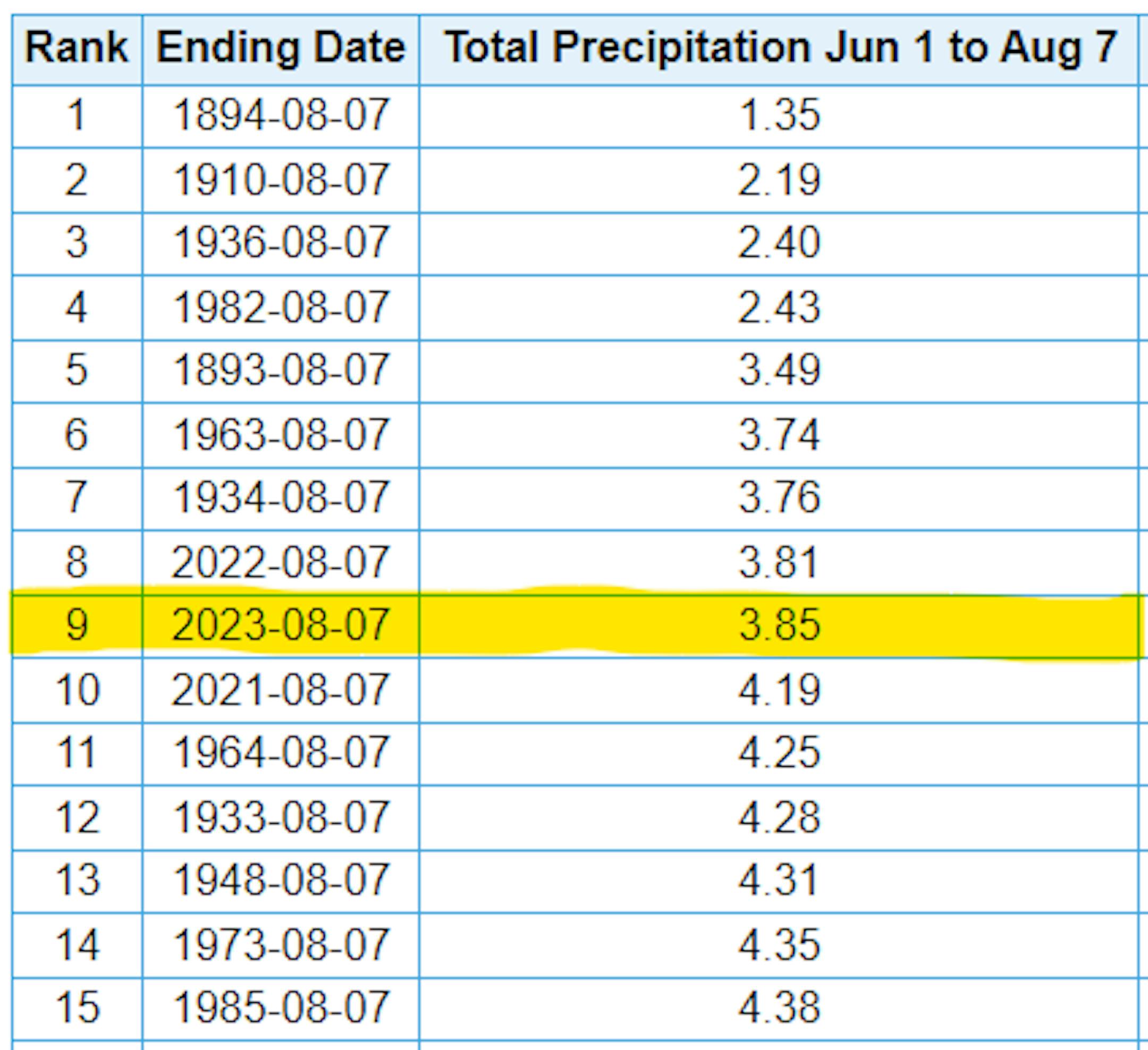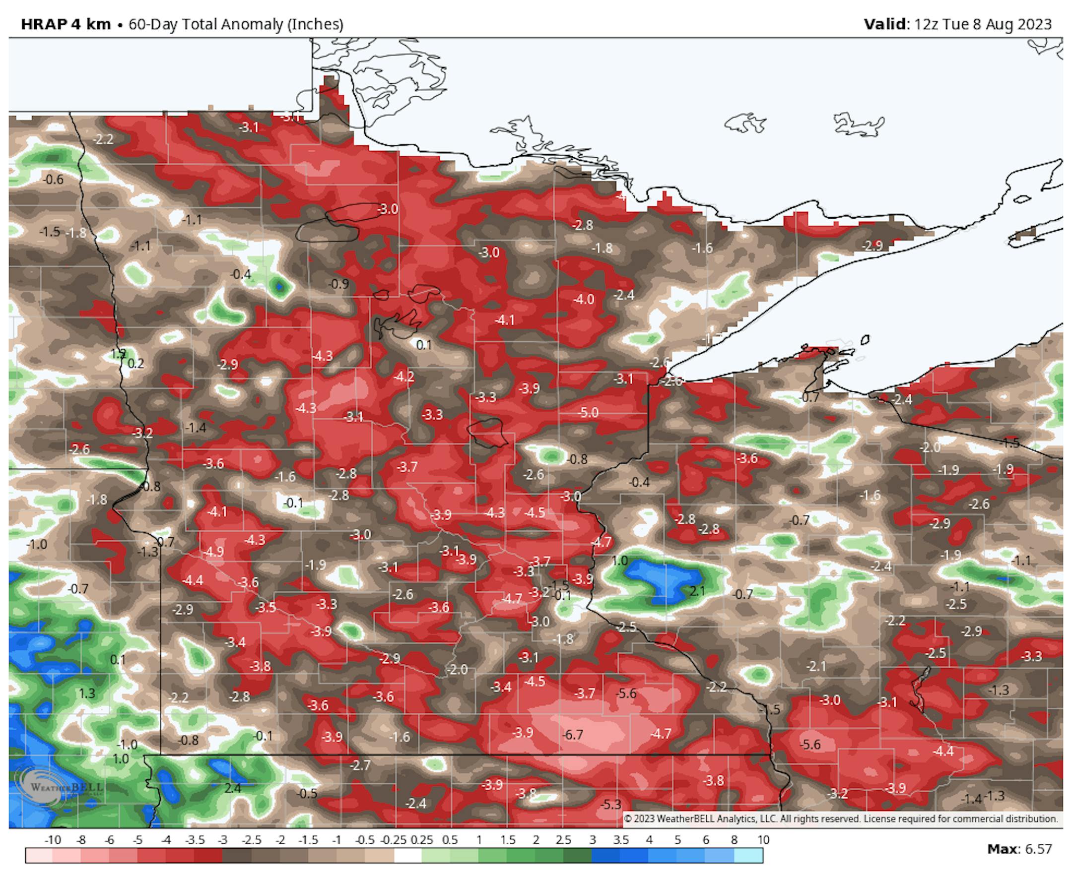 It has been very dry across much of the region so far this summer with only 3.85" of rain falling at the MSP Airport since June 1st. That is -5.80" below average and is the 9th driest Meteorological Summer on record with the driest being 1.35" set in 1894. Interestingly, the last two summers (2022 & 2021) were just as dry.