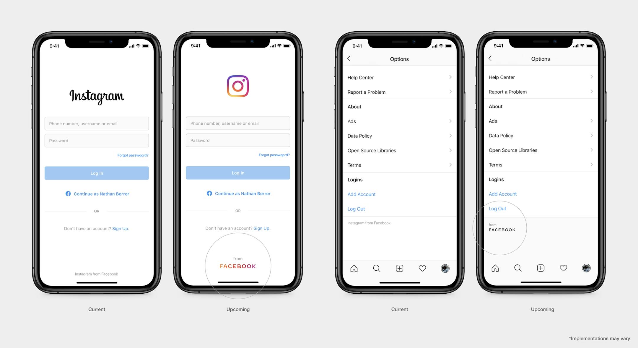 The new logo — which is the word "Facebook" spelled out vs. the white or blue "f" Facebook has used for years — will appear in places like the login screen and the settings page of Instagram and WhatsApp. Facebook began this effort earlier this year when it added "Instagram from Facebook" and "WhatsApp from Facebook" to both apps, but the new branding makes the message even more pronounced.